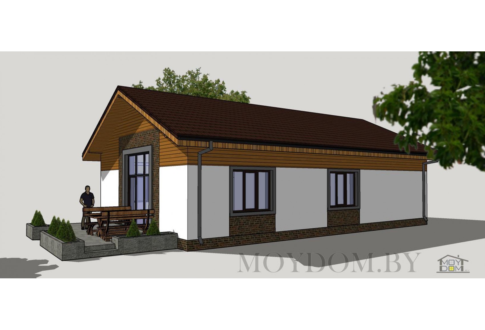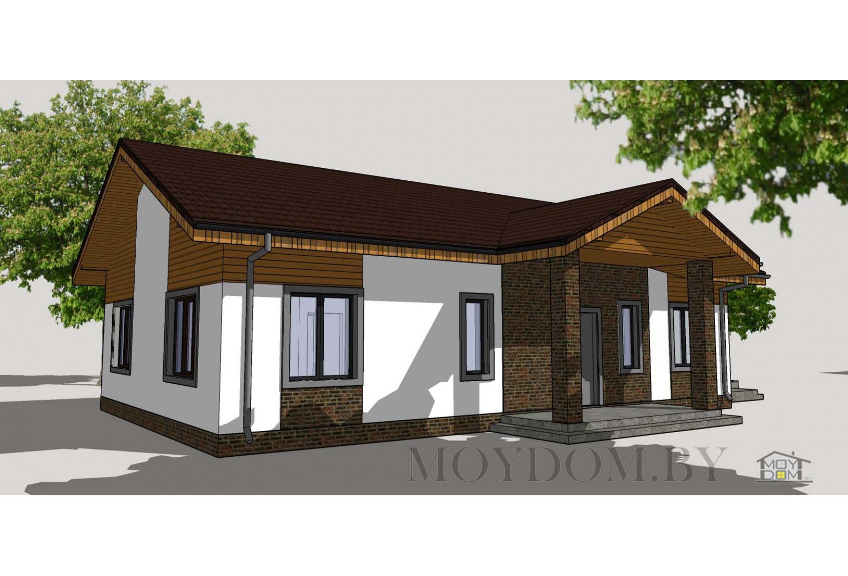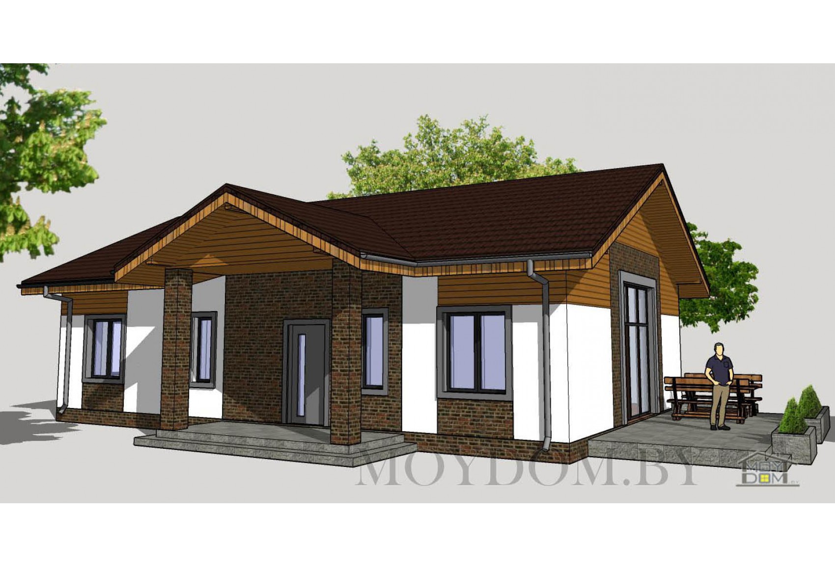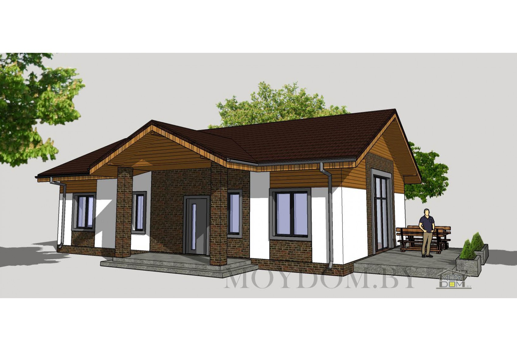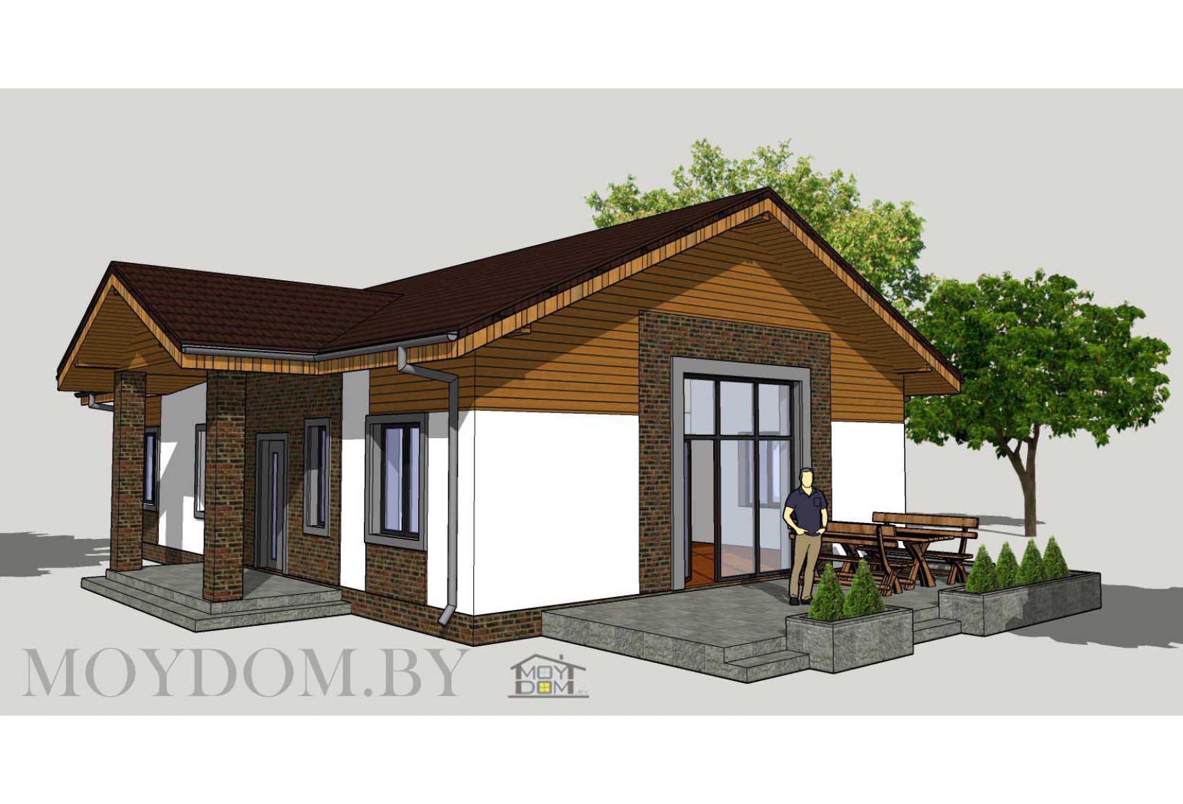 Этот проект берёт свои корни из проекта 395. Планировка почти та же, но здесь уже другой вид дома и терраса находится не сзади дома, а сбоку. Проект хорошо подойдёт для узких участков. Удобно будет пользоваться основным входом в отличие от обычного расположения, когда вход расположен непосредственно спереди, у дороги. Этот проект отличается повышенной высотой в гостиной — практически треть помещения имеет высоту 4,3м., что даёт совершенно другое восприятие пространства относительно всем привычных 2,5-2,7м. Затраты на подобный “второй свет” совершенно невелики: в этом месте отсутствуют балки перекрытия, но зато немного больше становится утеплителя и подшивки потолка. Да, возрастают теплопотери, но, относительно всего дома, это совершенно немного, но есть удовольствие от созерцания такого пространства, собственно, как и ликвидность дома увеличиваются.