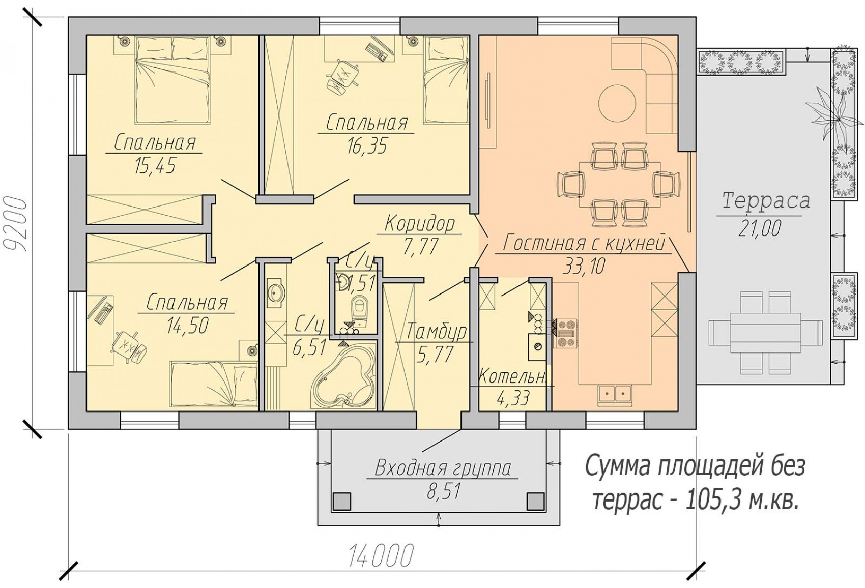 Теги: проекты домов серии 395, с террасой, 9 на 14, от 80 до 150 кв.м., 3 спальни, недорогой, небольшой, дачный, компактный, с двускатной кровлей, второй свет.