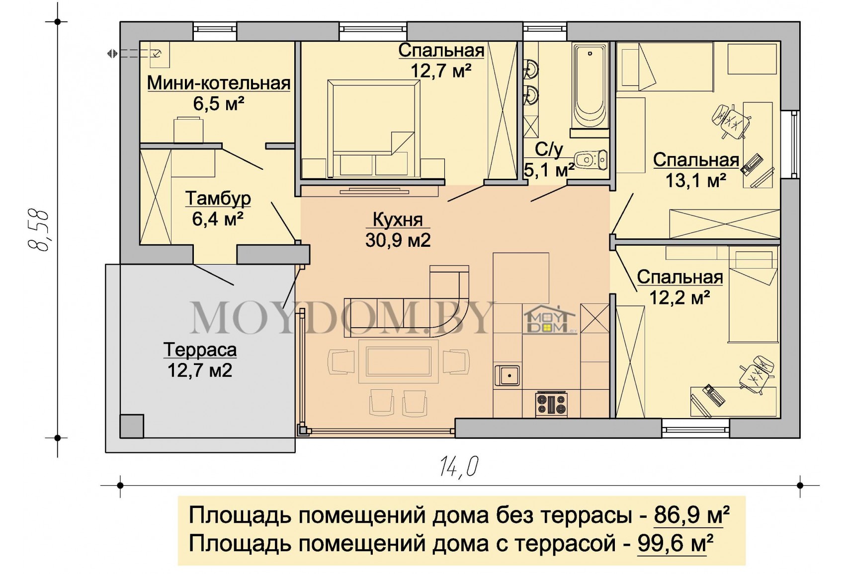 Проект этого одноэтажного небольшого дома выполнен в стиле хайтек с плоской крышей. Дом в целом для небольшой семьи, но с тремя спальнями – довольно вместительный. Одна из комнат при необходимости может стать кабинетом. Вход в дом осуществляется через террасу, с нее же можно попасть в мини-котельную и оттуда в дом. Войдя в дом, вы сразу попадаете в гостиную-кухню: обеденная группа расположена возле большого остекления во всю стену, что дает много света и воздуха помещению. Также, обедая или сидя с гостями в зоне отдыха, можно легко видеть, чем заняты дети, играющие за окном. Спальни и санузел расположены по периметру гостиной, таким образом члены семьи не мешают друг другу.