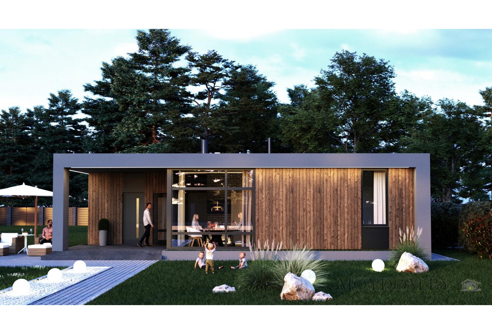 Такой проект дома может стать постоянным местом обитания небольшой семьи, дачным домиком для сезонной жизни или гостевым домом рядом с основным котттеджем. Его лаконичный стиль с правильными геометрическими линиями и большой зоной стекления создают образ современного и фунционального дома. А вечерняя подсветка делает этот образ в темное время парящим над окружающим ландшафтом. Для каких бы целей вы ни выбрали этот проект, он станет настоящим и уютным местом для жизни.