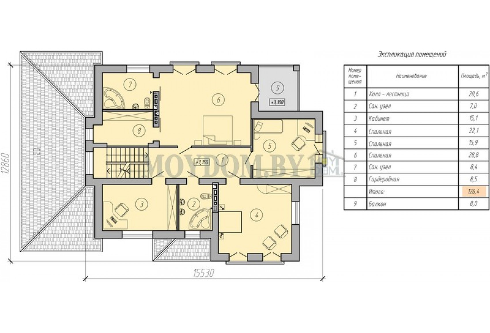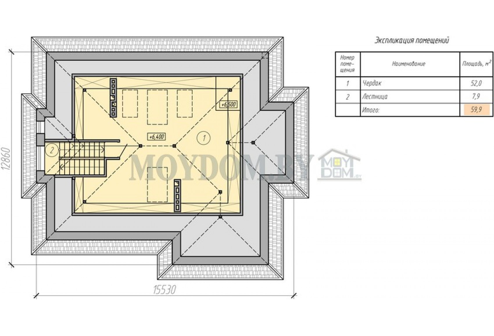 Помещения дома просторны и светлы благодаря планировке и большому количеству окон. Проектом этого двухэтажного дома предусмотрена также мансарда, обустроить которую можно по собственому усмотрению. Площадь жилых помещений составляет 136 м2, при этом и вспомогательные помещения также достаточно просторны – например, площадь холла у лестницы, ведущей на второй этаж, равна 19,5 м2, чтобы жителям дома было комфортно и удобно, ведь наверняка в таком доме будет жить большая дружная семья.