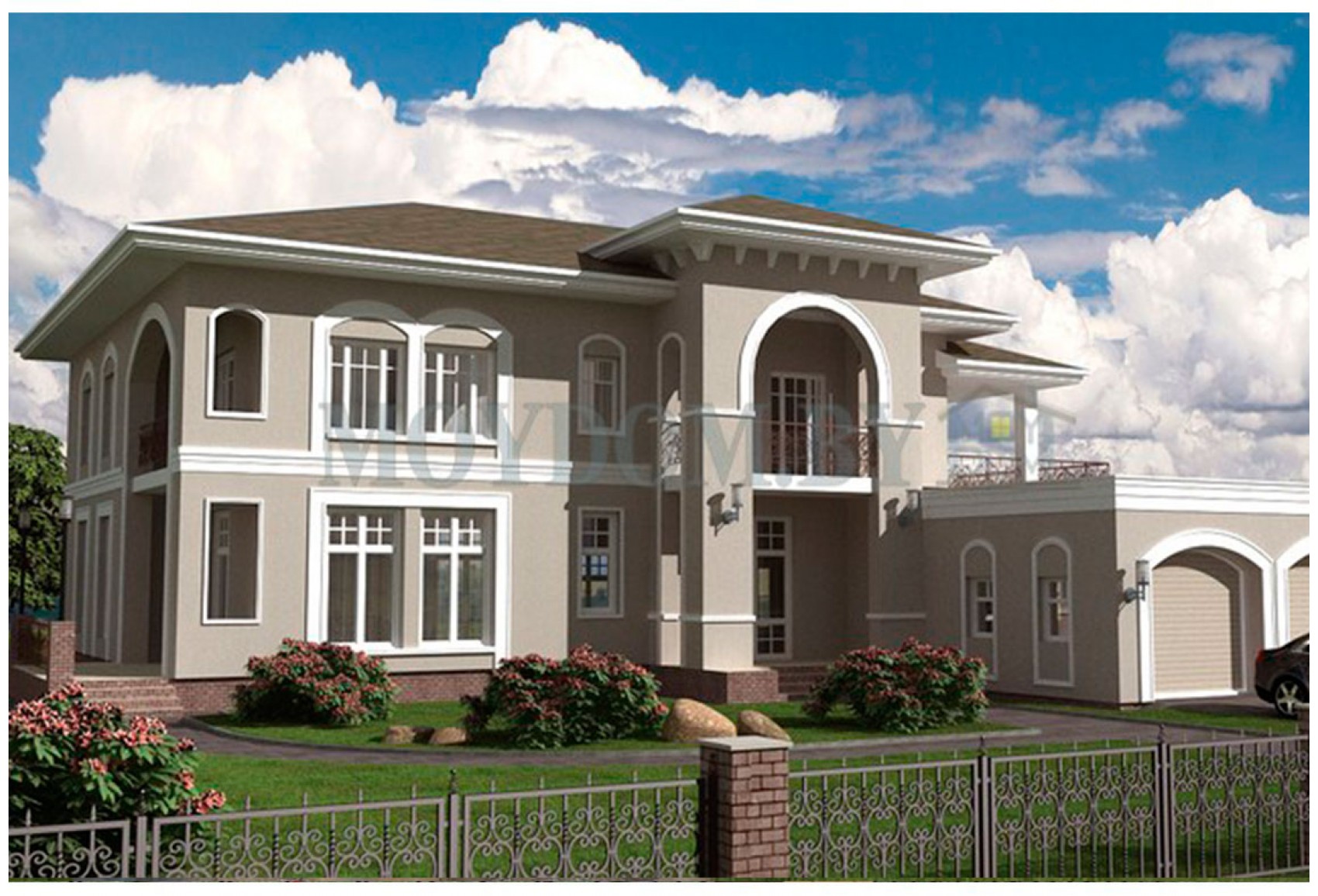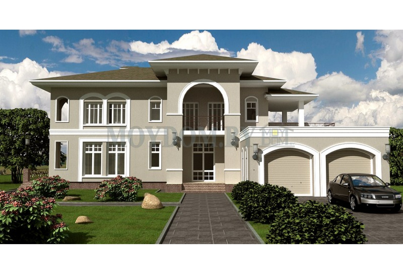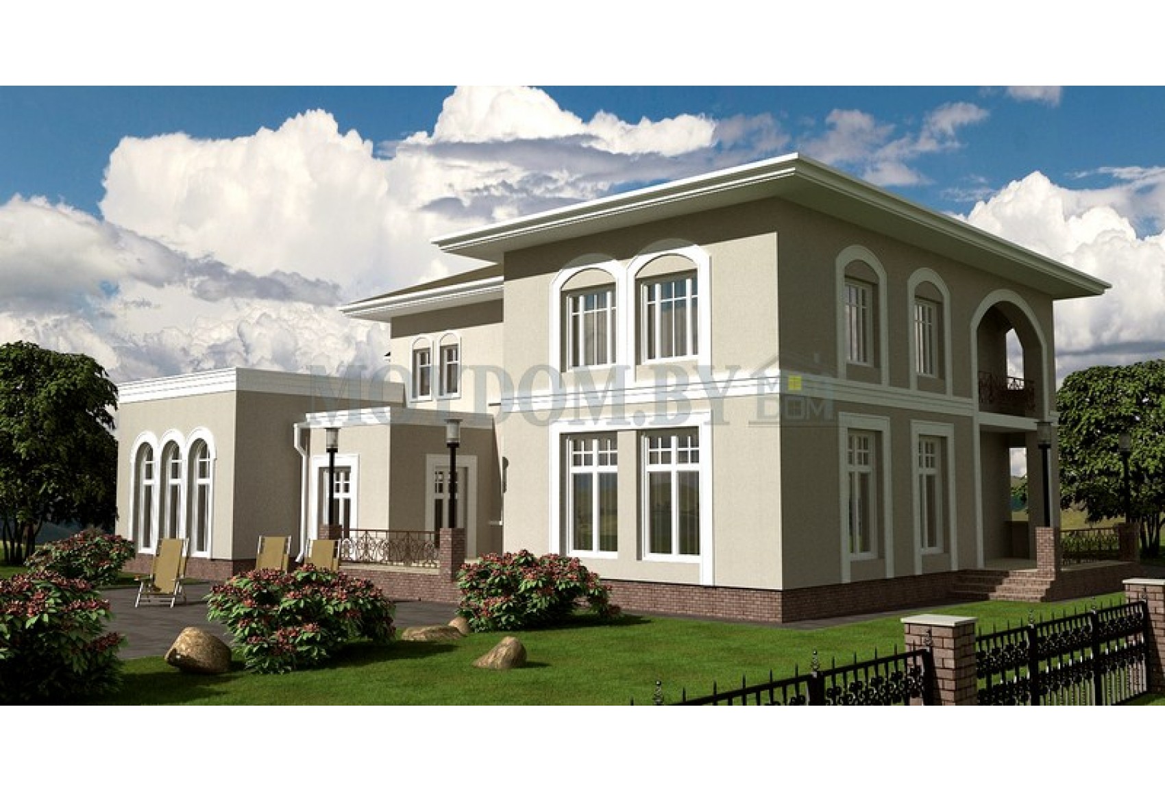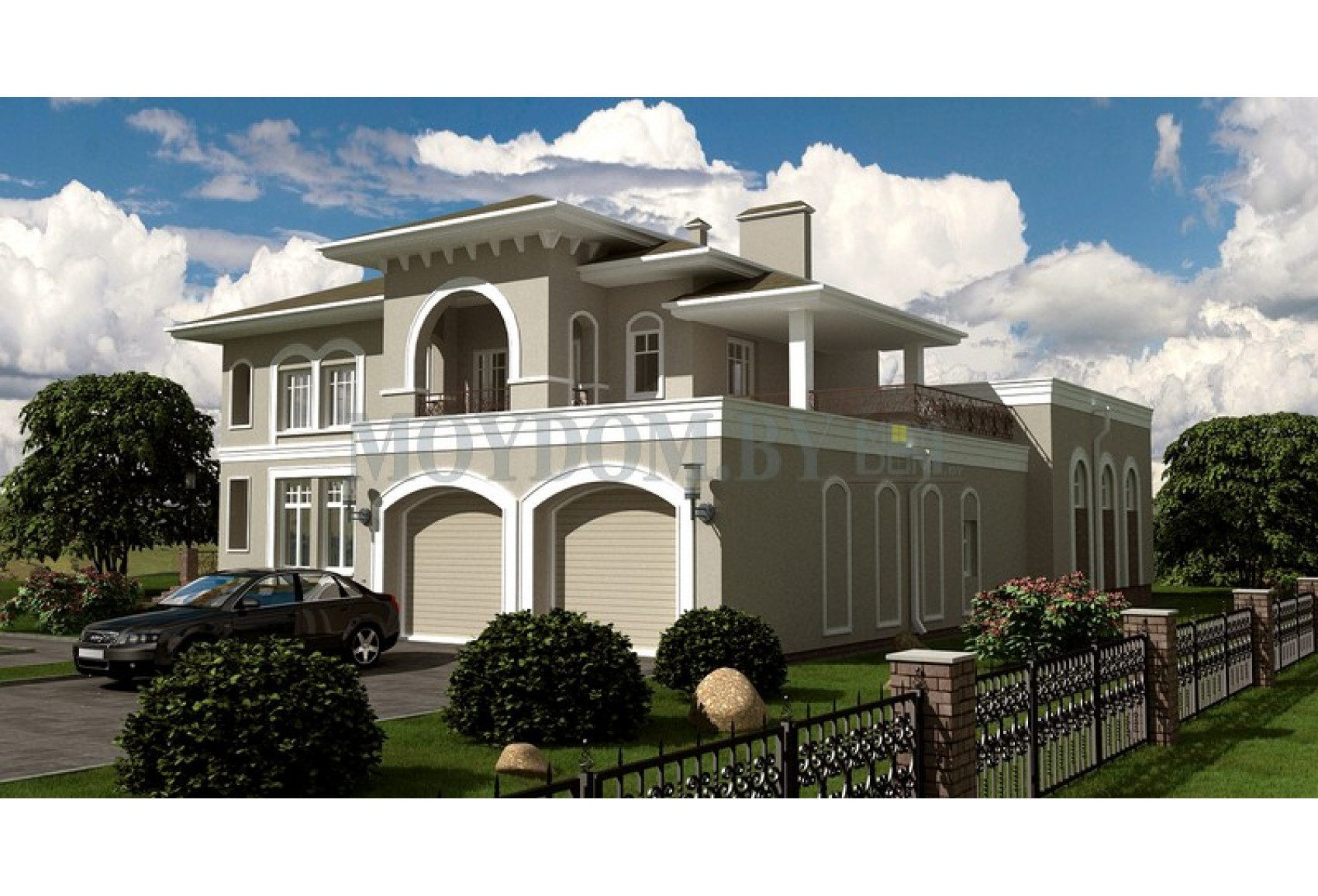 Проект двухэтажного дома, исполненый в средиземноморском стиле, весьма эксклюзивный. Если коротко, то этому стилю присущи такие черты: светлое, почти белое, цветовое решение фасада, кровля с небольшим наклоном, большие открытые лоджии, с частичным навесом от солнца большая открытая терраса над гаражом. Внутри дома, в соответствии со стилем, большое пространство кухни-столовой-гостиной – 100 кв.м., где много окон и выход на террасы.В доме есть подвал, в котором разместились кладовые и игровая комната. Обустройство его ограничивается лишь вашей фантазией. На первом этаже, помимо кухни-гостиной-столовой, объединенных в единое цельное пространство, спроектированы бассейн, тренажерный зал и сауна! В глубине дома лестница ведет на второй этаж, где вас ждут три довольно больших спальни плюс однахозяйскаяспальня со своими балконом, санузлом и гардеробом. Также в наличии еще один большой санузел. Две спальни имеют выход на общий балкон, а из холла можно попасть на большую террасу над гаражом.Комфортная и роскошная жизнь за городом в этом доме вам обеспечена.
