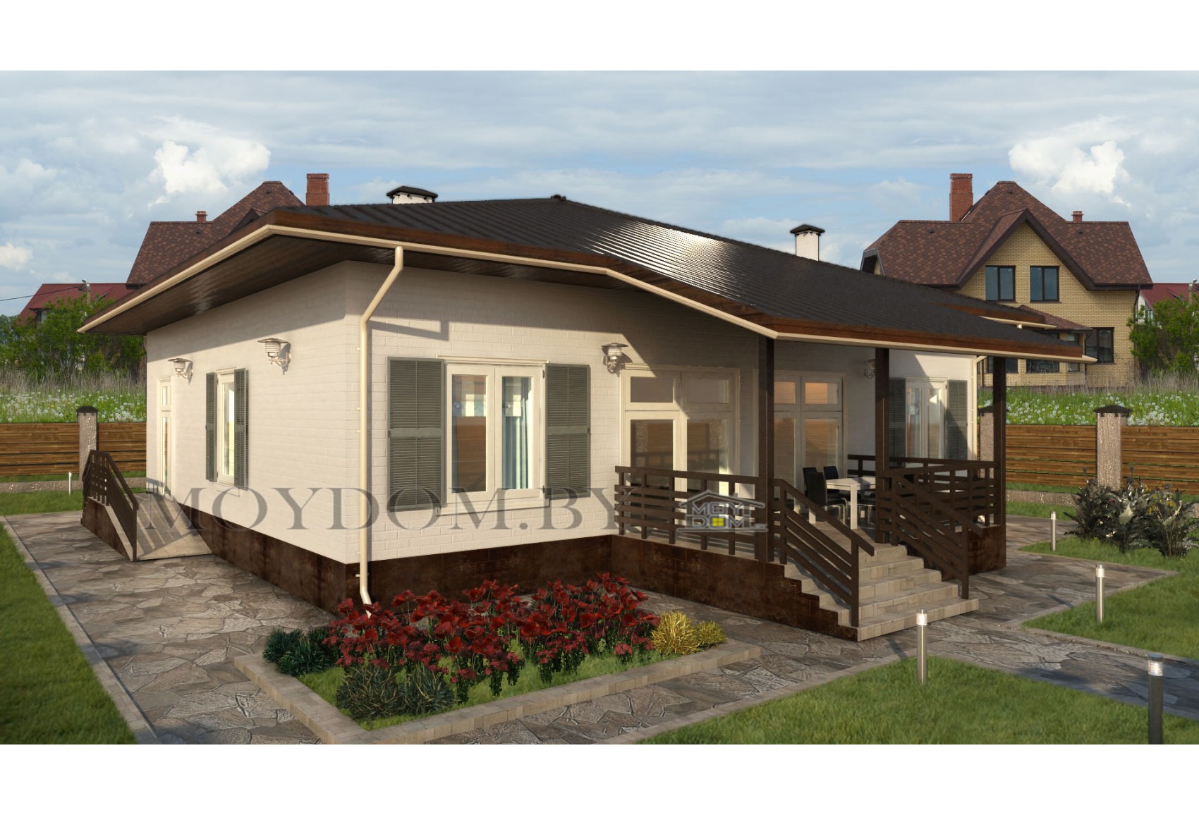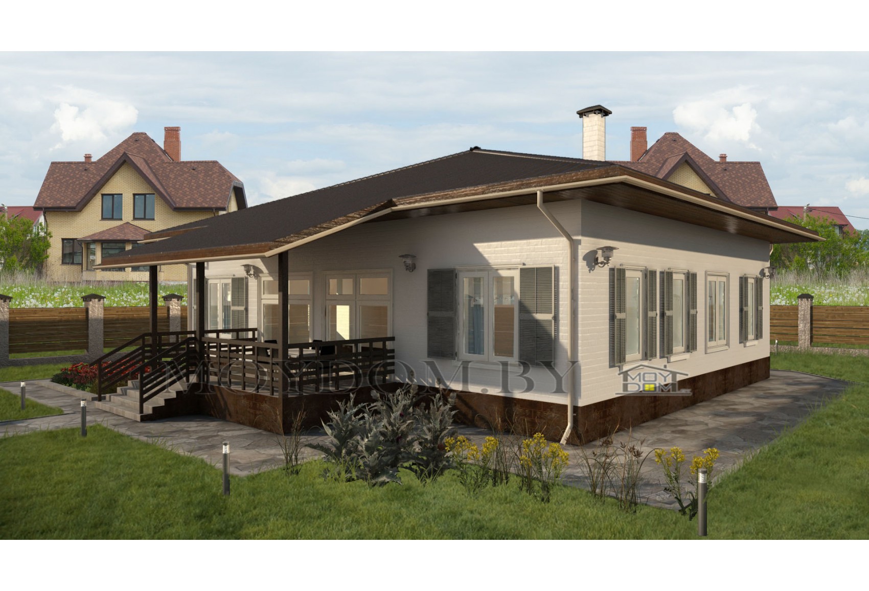 Проект дома №117-С – один из проектов в нашей мастерской. Этот проект четырехкомнатного одноэтажного дома с сауной предназначен для большой семьи. Примечательно, что в доме при сауне есть комната отдыха. Самое большое помещение в доме – гостиная-студия, которая одновременно является кухней и имеет выход на террасу. Внешний вид дома можно назвать стильным и интеллигентным: сдержанные приятные цветовые решения, окна в светлых рамах со ставнями, стеклянные входные двери. Все говорит о том, что дом предназначен для активной семьи и дружеских посиделок на свежем воздухе.