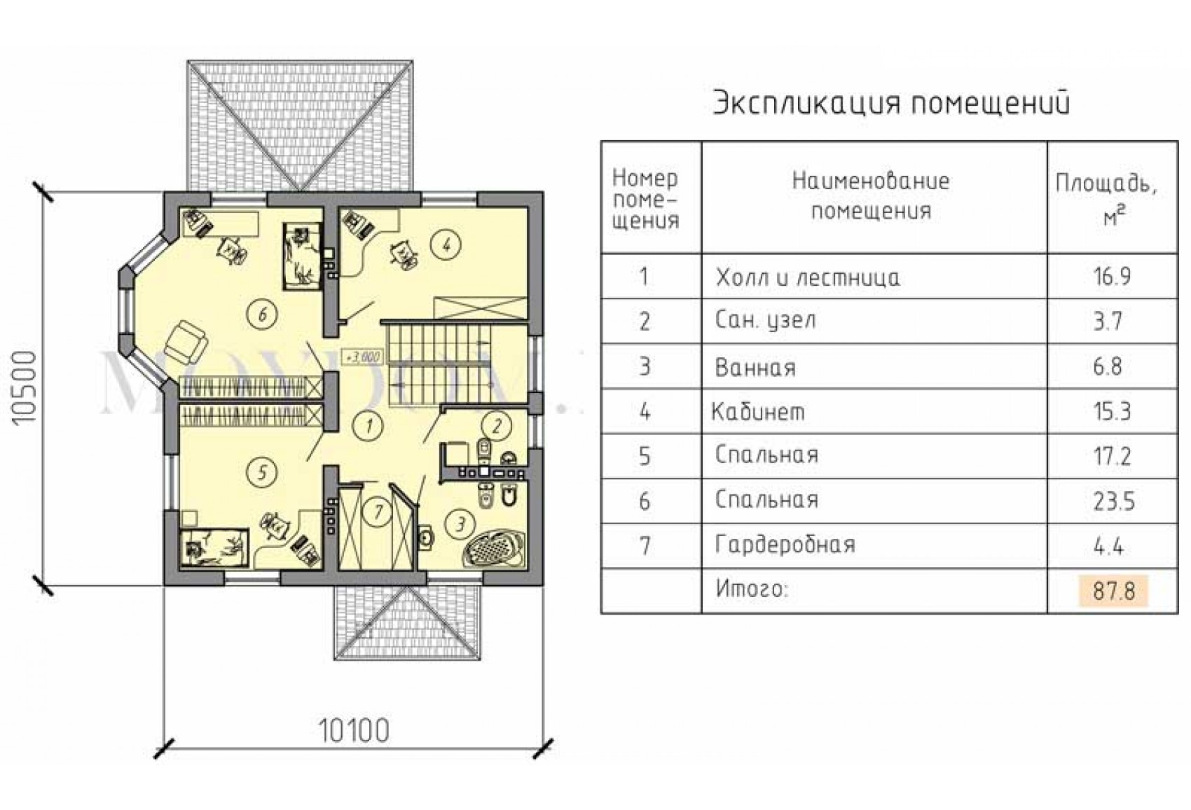 Теги: 10 на 10, от 150 до 200 кв.м., с 4-х скатной кровлей, квадратный, в классическом стиле, 3 спальни, 4 комнаты, с кабинетом, с гардеробной, с эркером, с террасой.