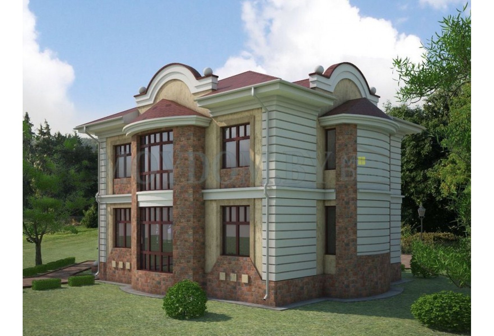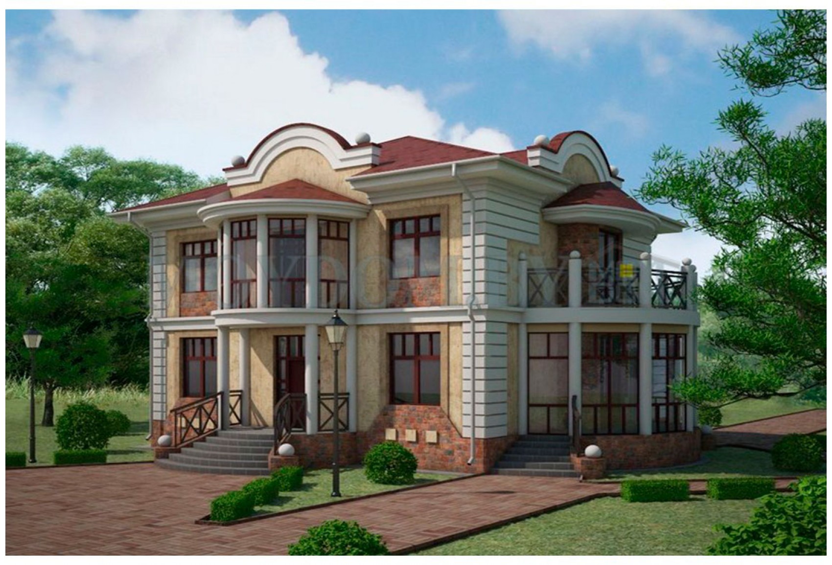 Теги: 11 на 11, 10 на 10, квадратный, от 150 до 250 кв.м., с 4-х скатной кровлей, в классическом стиле, модерн, с эркером, с фронтоном, 3 спальни, с кабинетом, 5 комнат, с гардеробной, с большой гостиной, с крытой террасой, с балконом