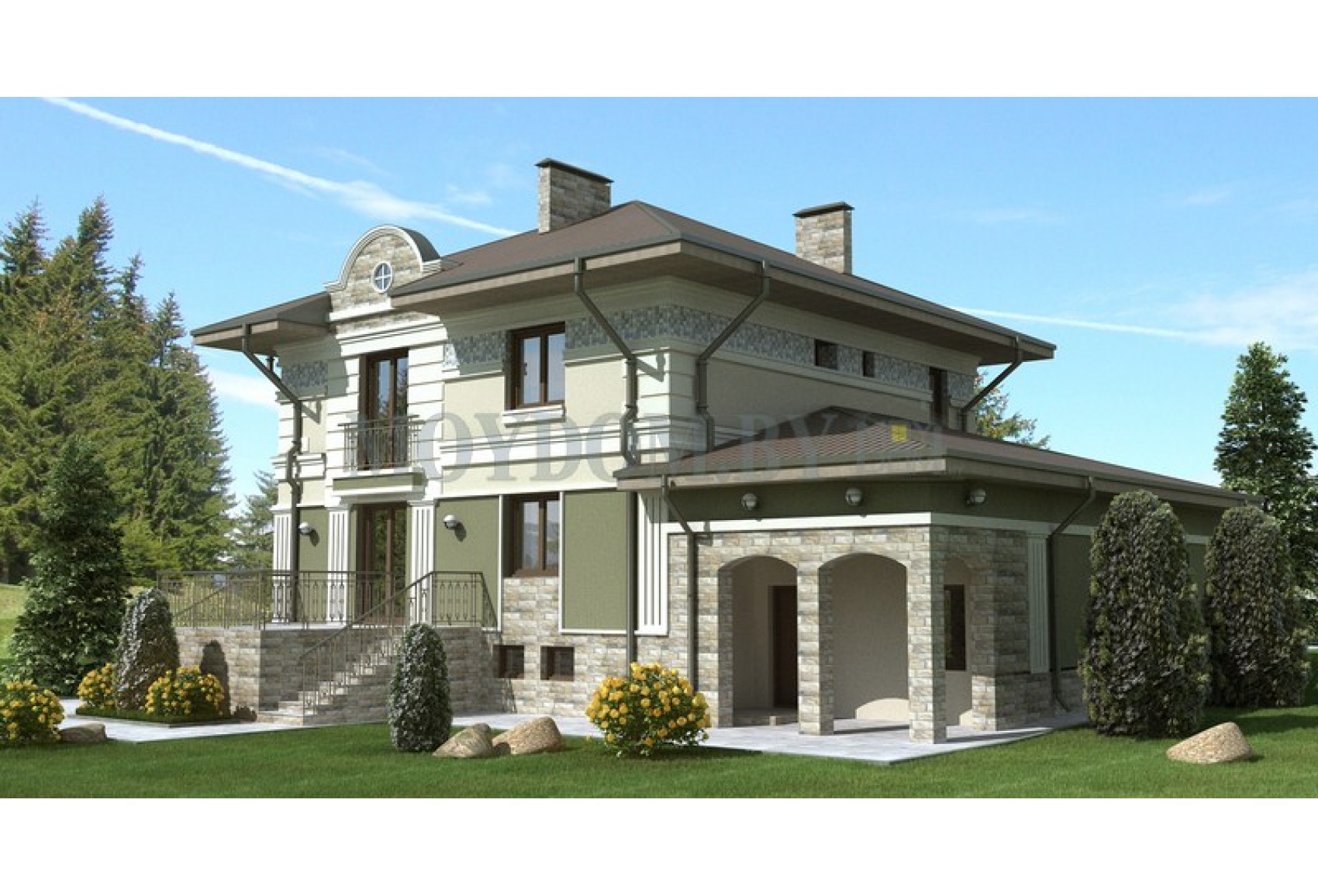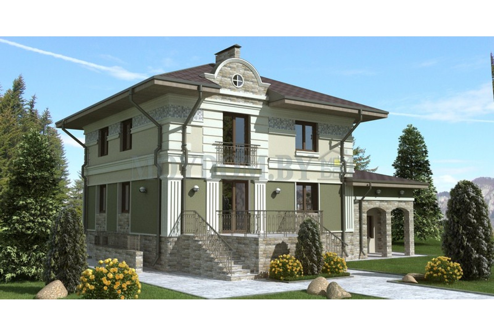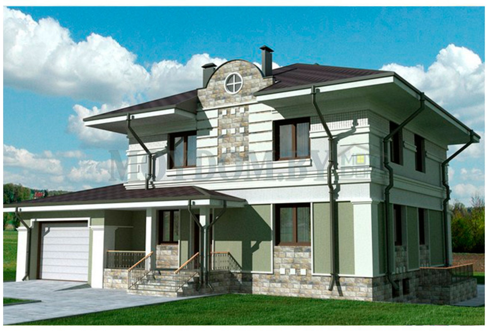 Данный проект родился из проекта №95. Этот красивый проект двухэтажного дома удобен для перспективы разделения дома на две отдельные квартиры. Проектом предусмотрено два отдельных входа, что в принципе является уникальной особенностью дома. Снаружи дом никак не выглядит двухквартирным. Примечательно, что ситуации в жизни бывают разными, к примеру, дети захотят жить отдельно, но средств нет, вот тогда и можно будет этот дом легко разделить на две квартиры. Достаточно просто заложить проём, ведущий с лестницы с площадки второго этажа на первый. А если ваш участок не имеет уклона, то гараж и вход при желании можно "поднять".