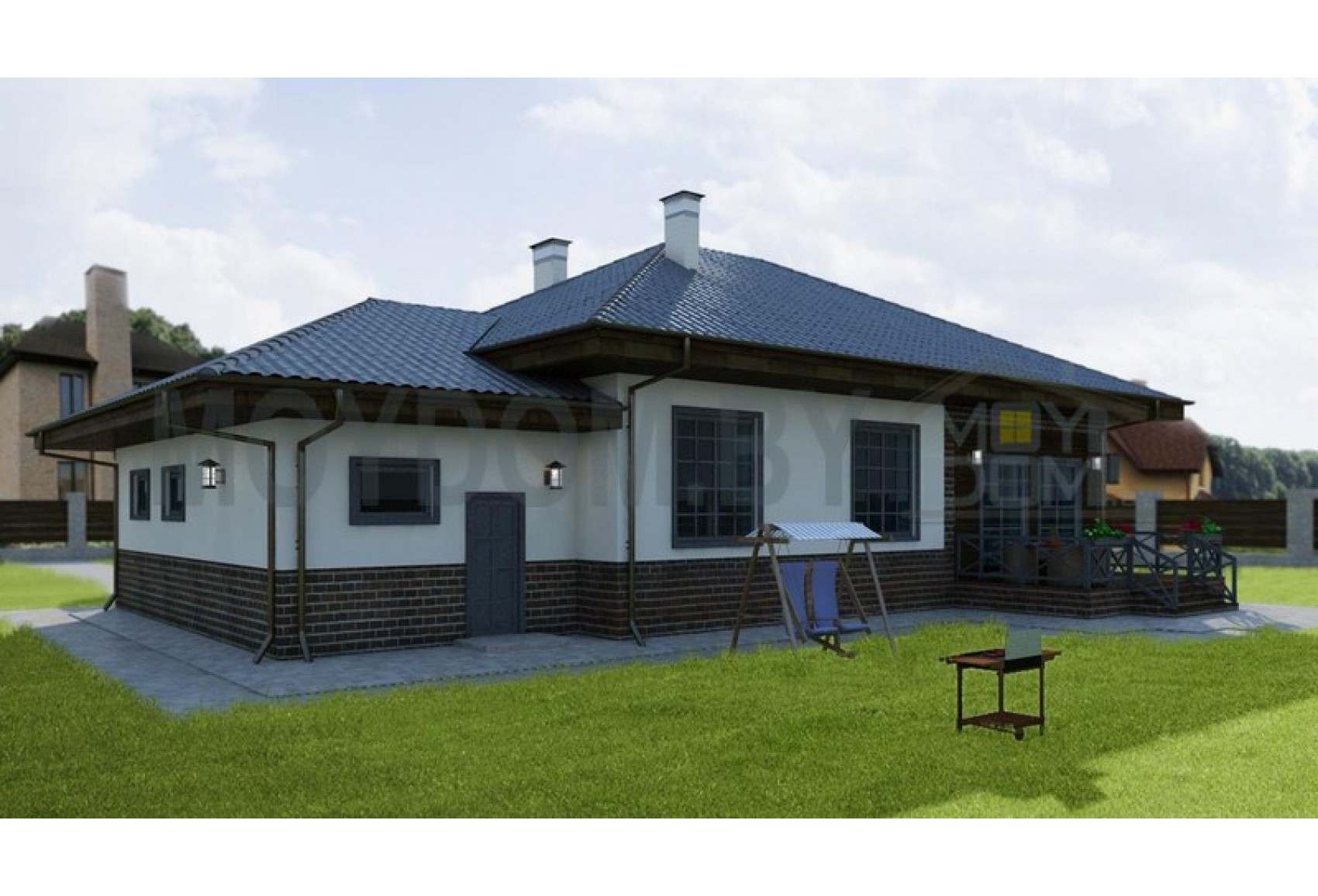 Теги: Серия проектов домов 243, проект одноэтажного коттеджа, от 150 до 200 кв.м, с гаражом, с террасой, с 4-х скатной кровлей, с хозпомещением, топ, 3 спальни.