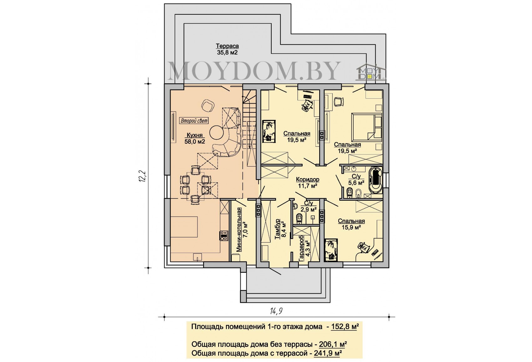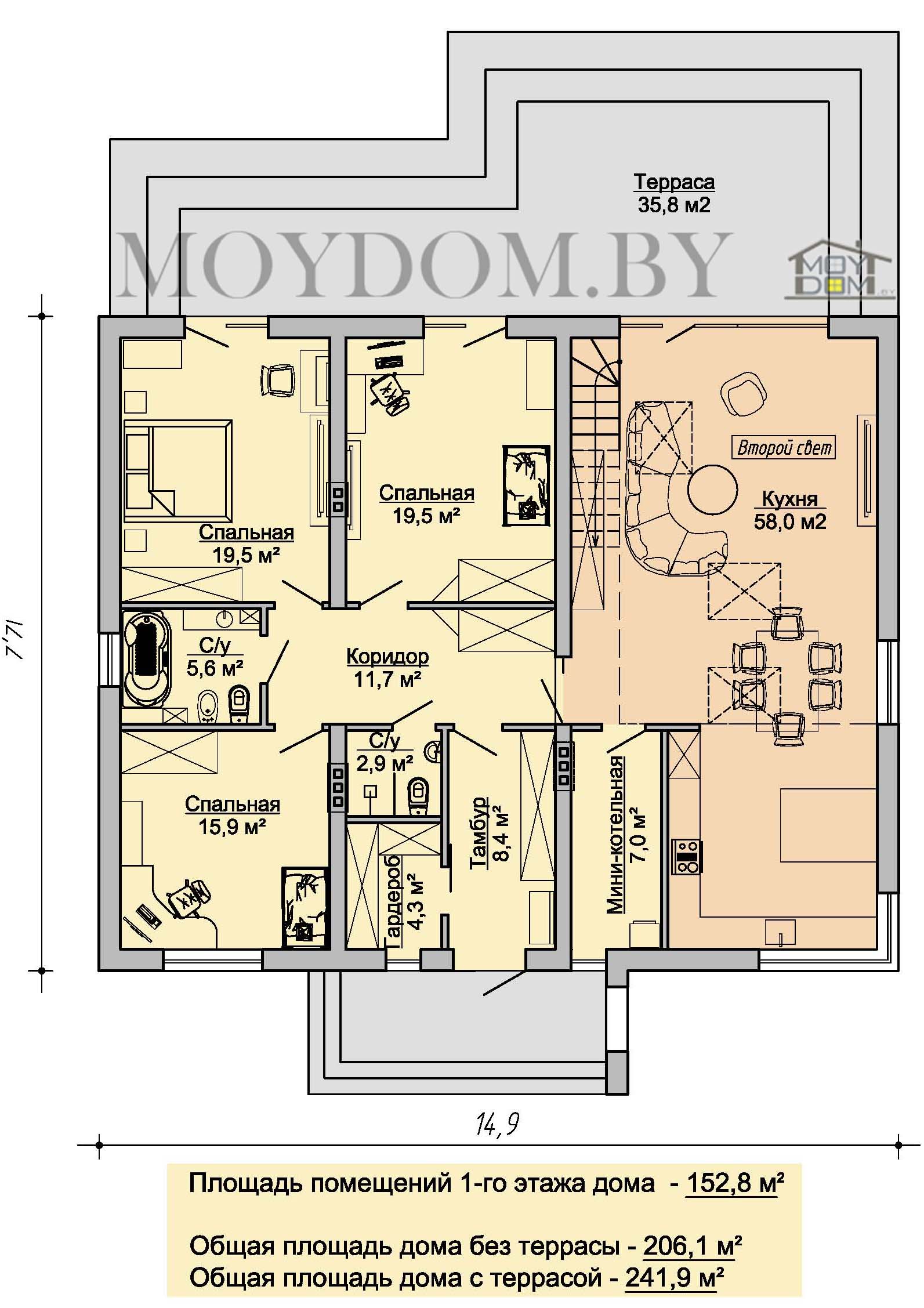 Теги: Серия проектов домов 243, от 150 до 200 кв.м., мансардой, с террасой, с 4-х скатной кровлей, топ, 3 спальни, с угловыми окнами, второй свет, с кабинетом, 12 на 15, окна в пол, красивые, современный