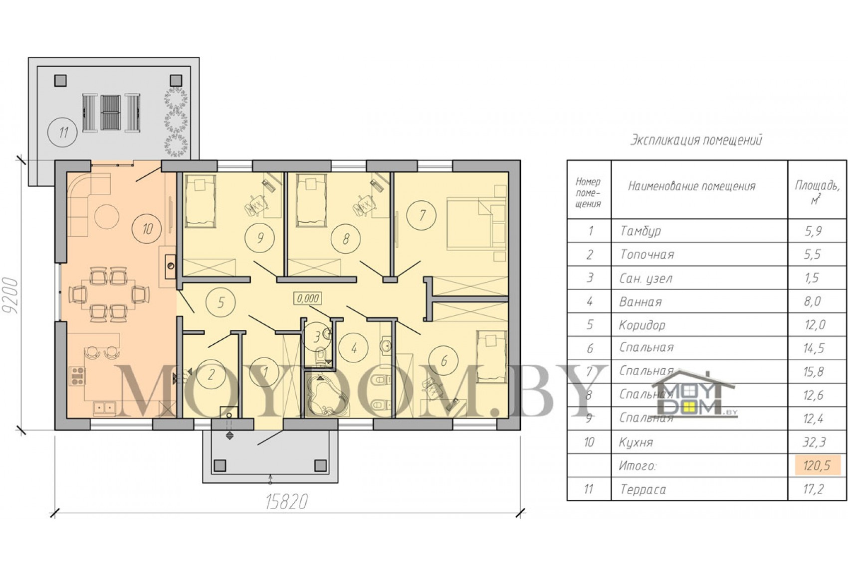Проект дома №395-А - это одноэтажный дом с четырьмя жилыми комнатами, просторной кухней (32,2 кв.м). Площадь дома позволяет комфортно жить в нем круглый год со всеми удобствами. Одну из спален можно легко переоборудовать в кабинет или игровую. В отличие от проекта №395 в этом проекте одноэтажного дома терраса – 17,2 кв.м.