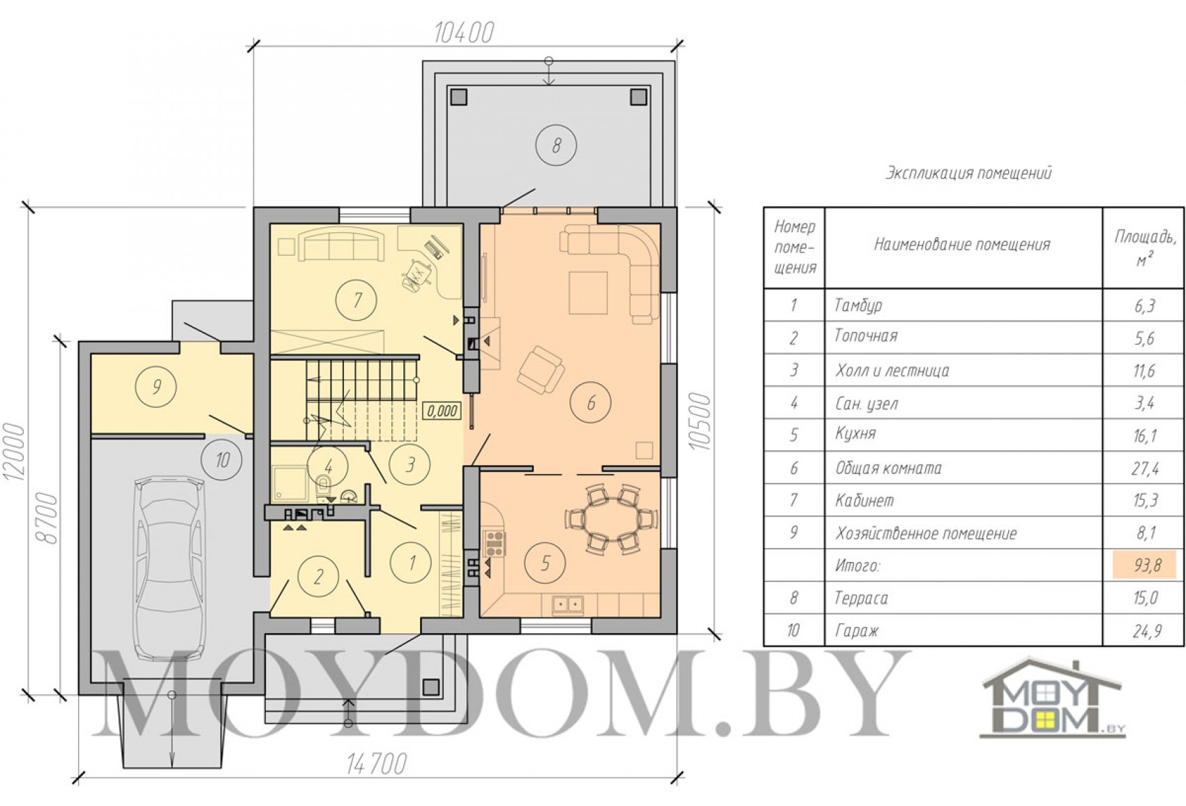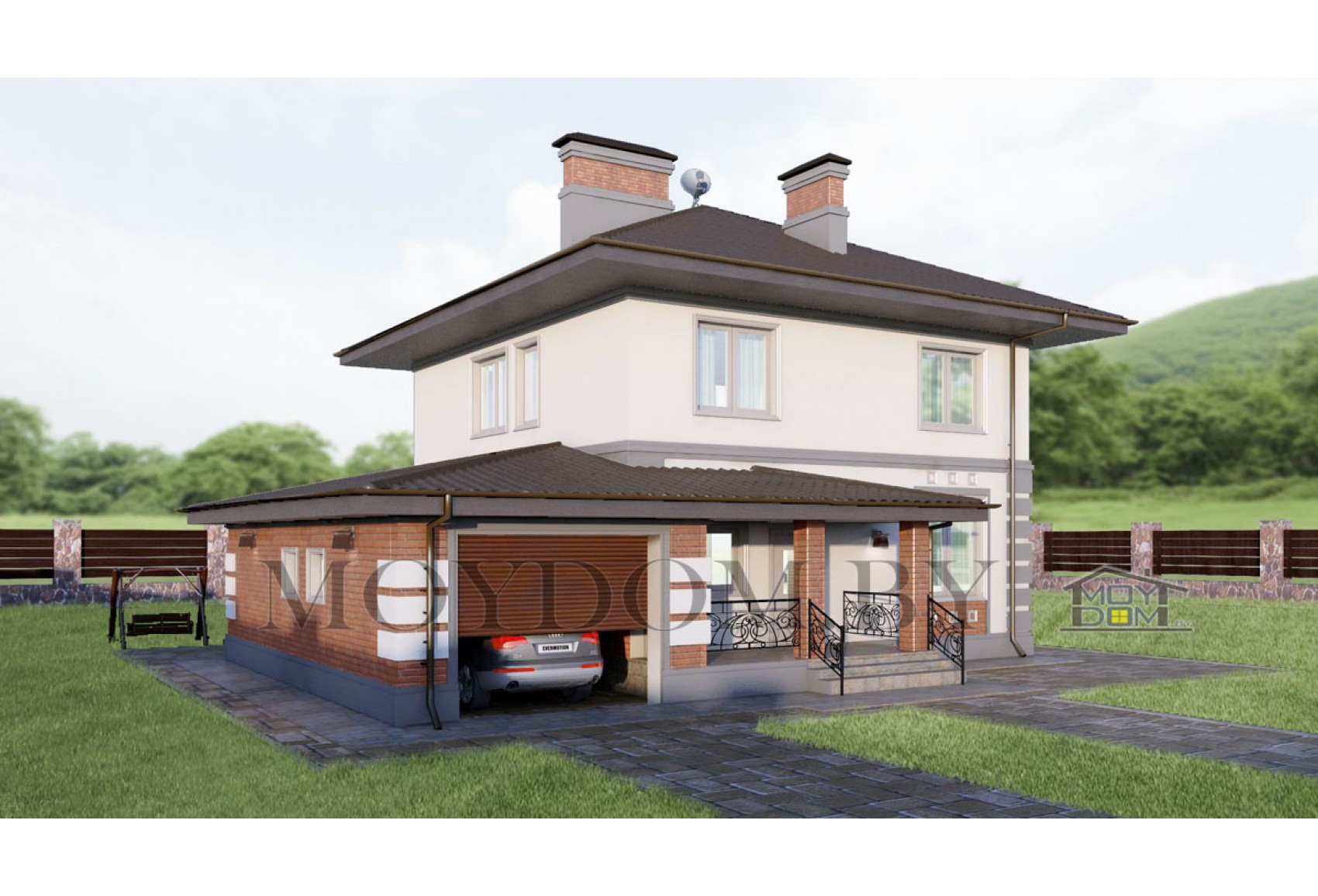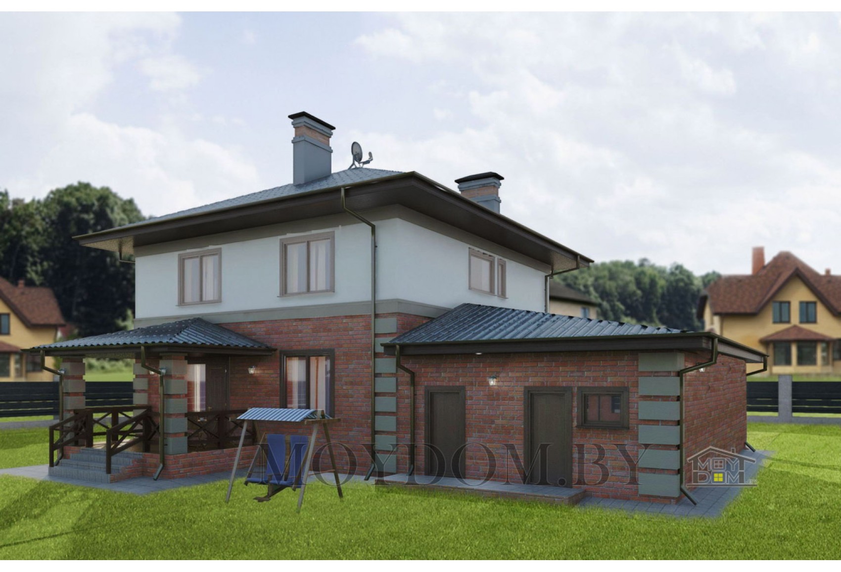 Один из самых лучших и популярных проектов современного дома из простых и недорогих двухэтажных домов. Высота потолка 3 метра, окна все по 1,75 м. Все последние современные конструктивные решения в этом проекте. Светлый тон стен гармонирует с темно-коричневой четырехскатной кровлей дома. Строгие геометрические линии постройки и правильных ровных форм отделочные элементы придают этому дому элегантность. Классическое размещение комнат: на первом этаже справа от входа вместительная кухня-столовая и гостиная с открытой террасой, разделенные дверью-купе. У лестницы прямо разместился кабинет, который при желании можно сделать спальней. Небольшой санузел и топочная с выходом в гараж завершают картину первого этажа. Тихий и спокойный второй этаж вместил в себя 3 просторных спальни, большую ванную комнату, санузел и отдельную гардеробную. Гараж с входом в дом через топочную пристроен с левой стороны дома. А с обратной стороны гаража расположено два хозяйственных помещений, функционал которых определять вам. Двухэтажный дом очень комфортный и функциональный.