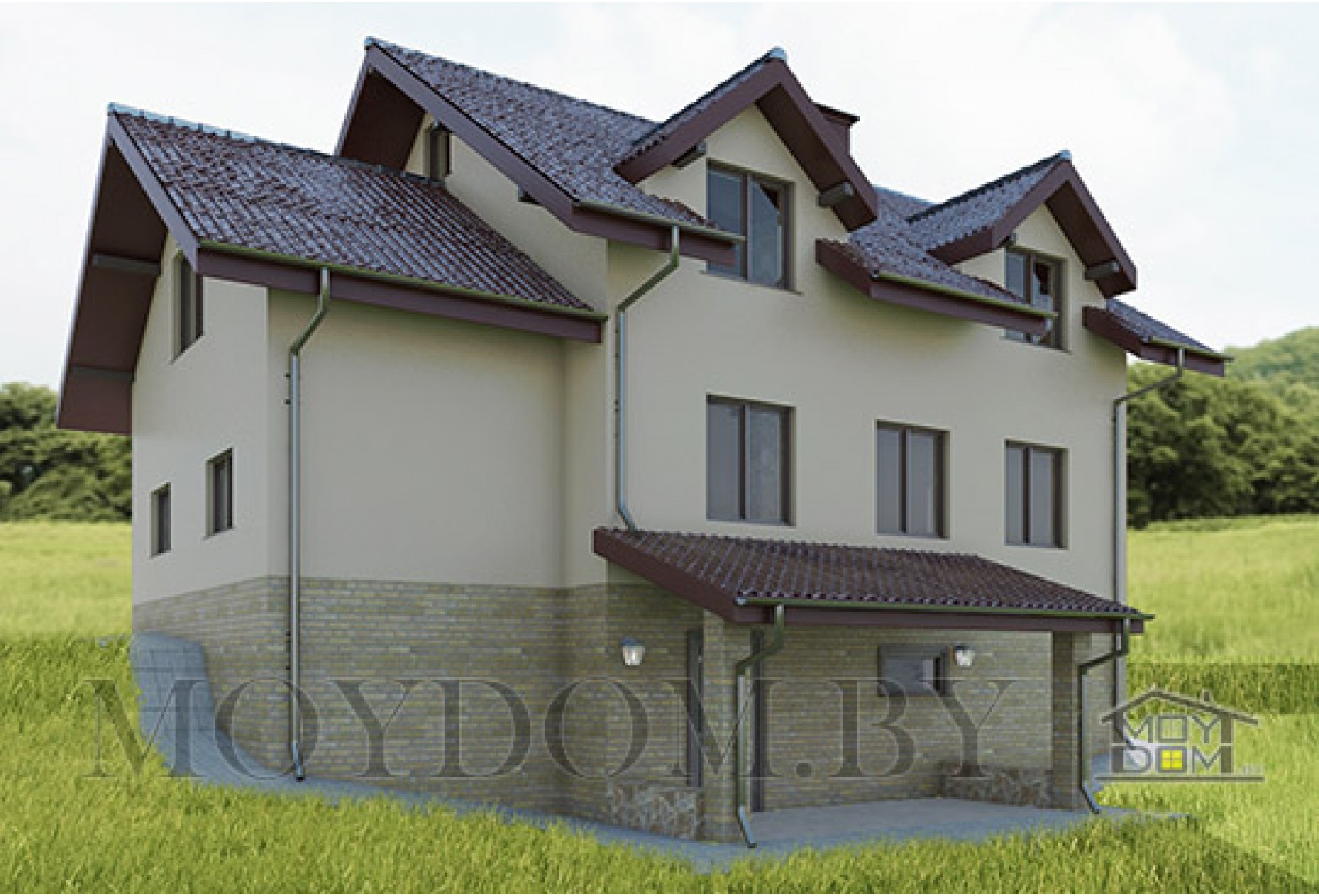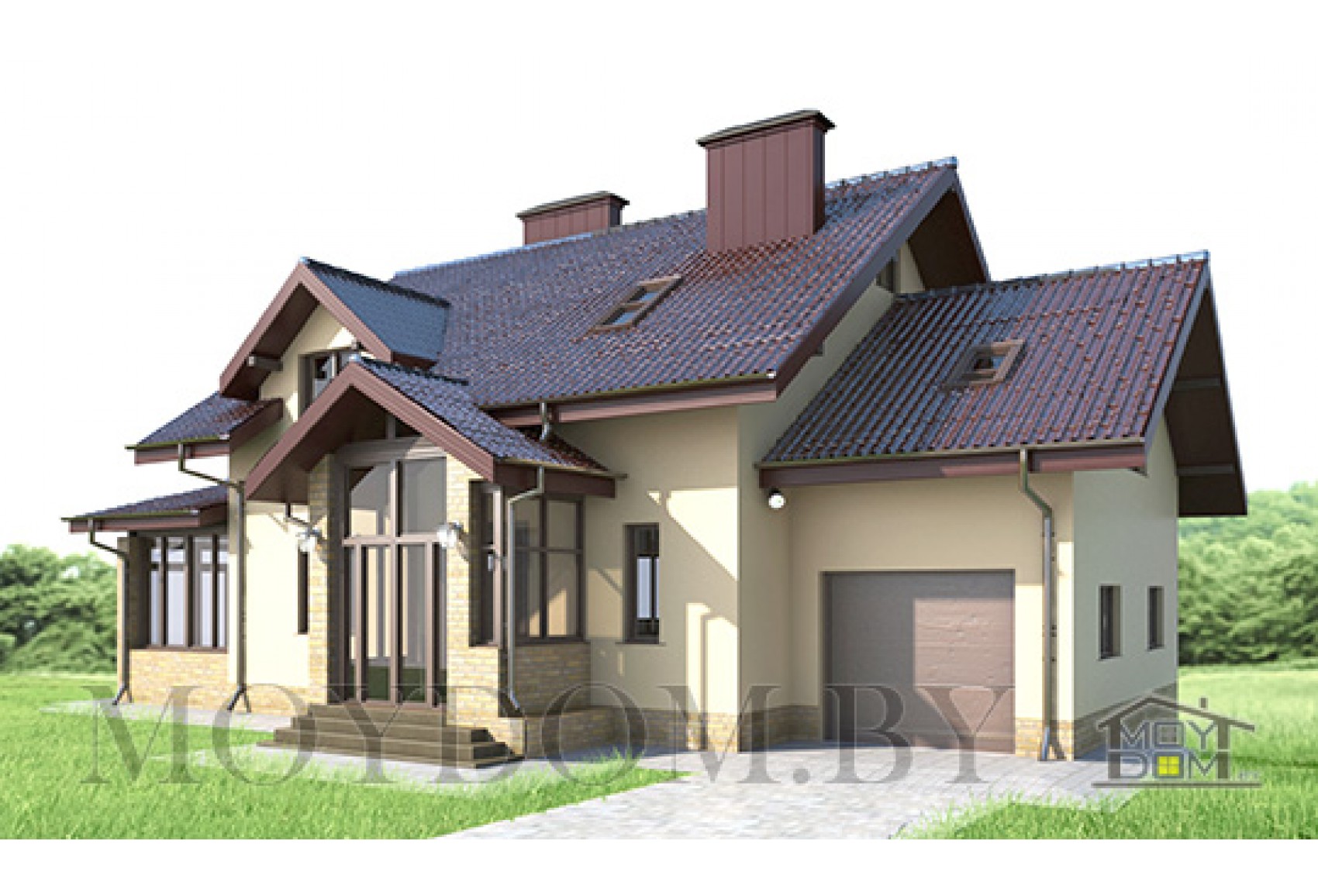 Каждый проект дома с цокольным этажом уникален и имеет свои особенности. Этот проект одноэтажного дома с мансардой предназначен для участка с перепадом в один этаж. В проекте есть подвал, довольно большой, с несколькими комнатами, которые вы можете использовать по своему усмотрению, и сауна. Благодаря этим хозяйственным помещениям отпадает необходимость размещения сарая на участке, что не может не радовать. Первый этаж занимают кухня с выходом на террасу, гостиная и гостевая комната, на мансарде 3 спальни и кабинет. Над гаражом имеется кабинет "для папы". К дому примыкает гараж на 1 машину. Есть вариант этого проекта без подвала для ровного участка.