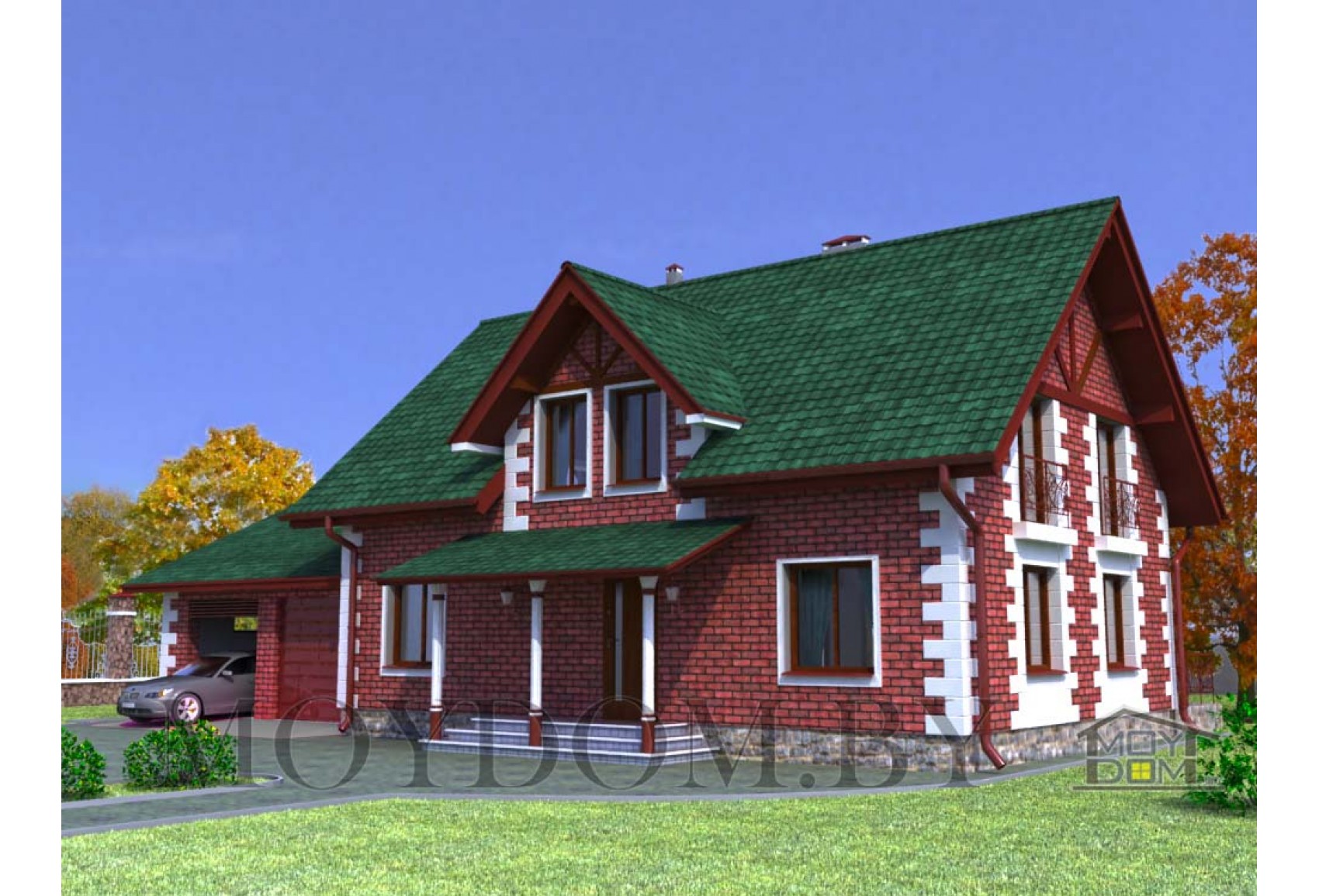 Яркий и необычный – первое впечатление от такого дома с мансардой. Стены красного кирпича под зеленой крышей – удвительно гармоничное сочетание цветов! Здесь прослеживается немного упрощенный английский стиль: прямоугольная симметрия плана дома; высокий цоколь; стены под кирпич; симметрично установленные одинаковые окна; обязательный козырек, держащийся с помощью портика; двускатная крыша с небольшим свесом.