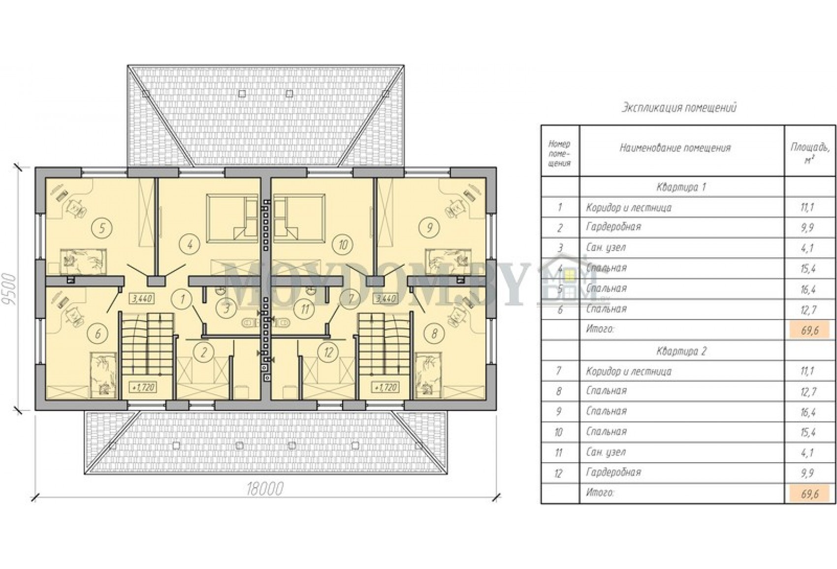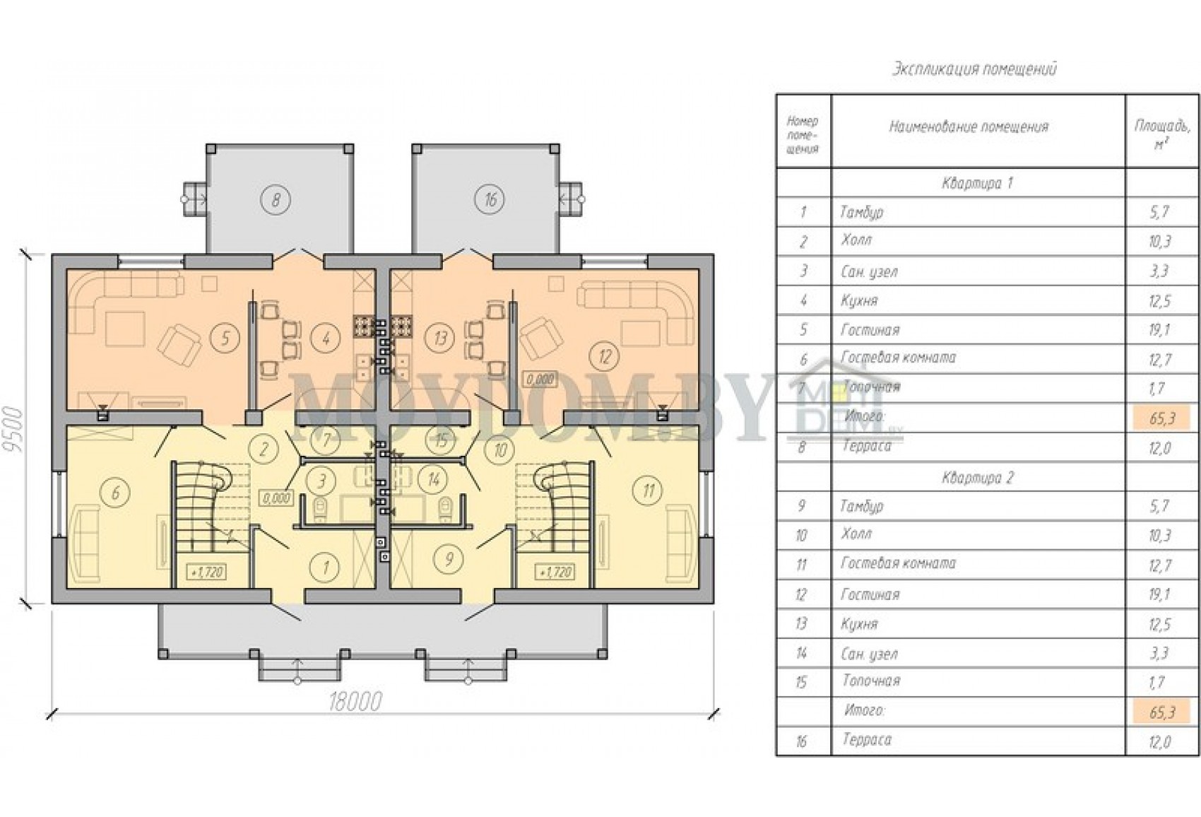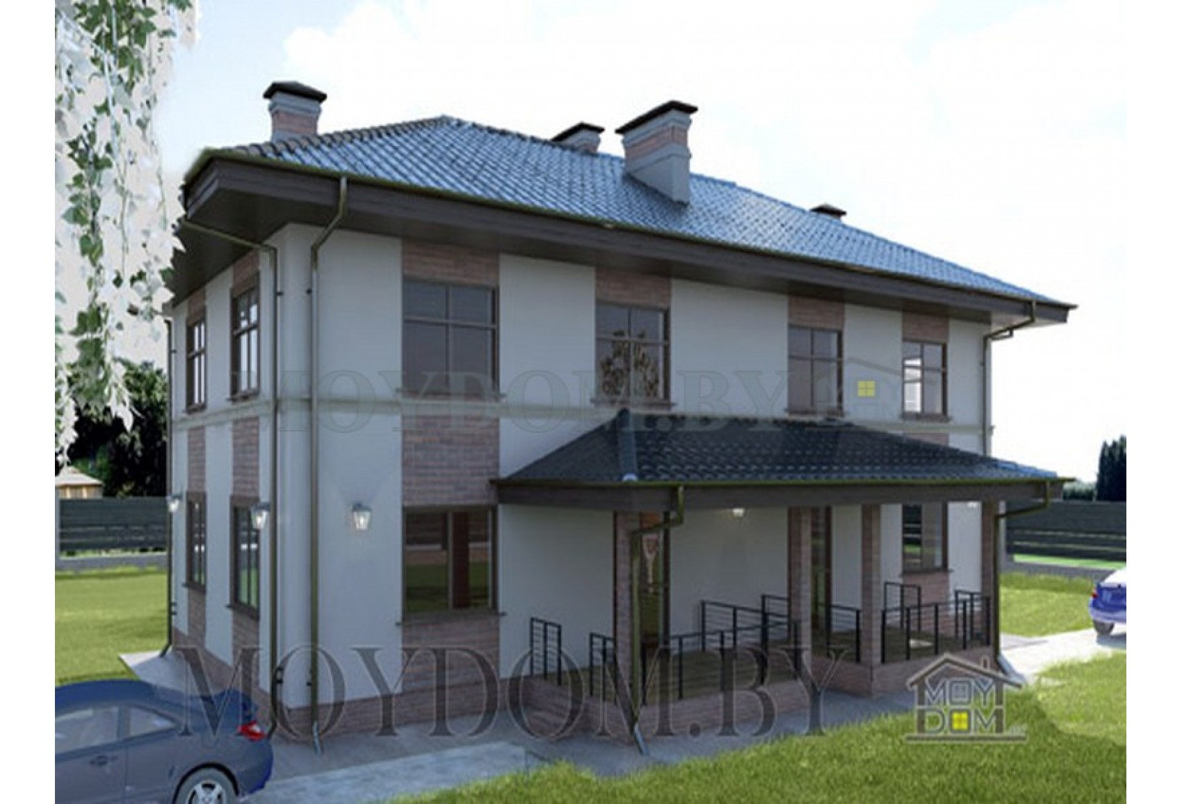 Отличный проект блокированного двухэтажного дома 9 на 18 площадью 280 м.кв. с террасой запроектирован с двумя отдельными входами. Этот проект жилого дома является “братом” проекта на одну квартиру 95-04. Планировка квартир зеркальная что на первом, что на втором этаже. Первый этаж дома занимает гостиная, кухня и гостевая комната, второй - три спальни, гардероб и постирочная. С кухни есть выход на небольшую террасу 12 кв.м. Планировка этого двухэтажного дома классическая, здесь все только самое необходимое для комфортной и удобной жизни. Внешне дом выглядит очень респектабельно и не потеряется среди других застроек. Аналог этого проекта проект 95-04. Этот проект дома подойдёт для небольшого участка и не требует больших денежных вложений. Проект двухэтажного дома подойдет для строительства на участке шириной более 24 м. Площадь каждой квартиры составляет 140 м.кв.
