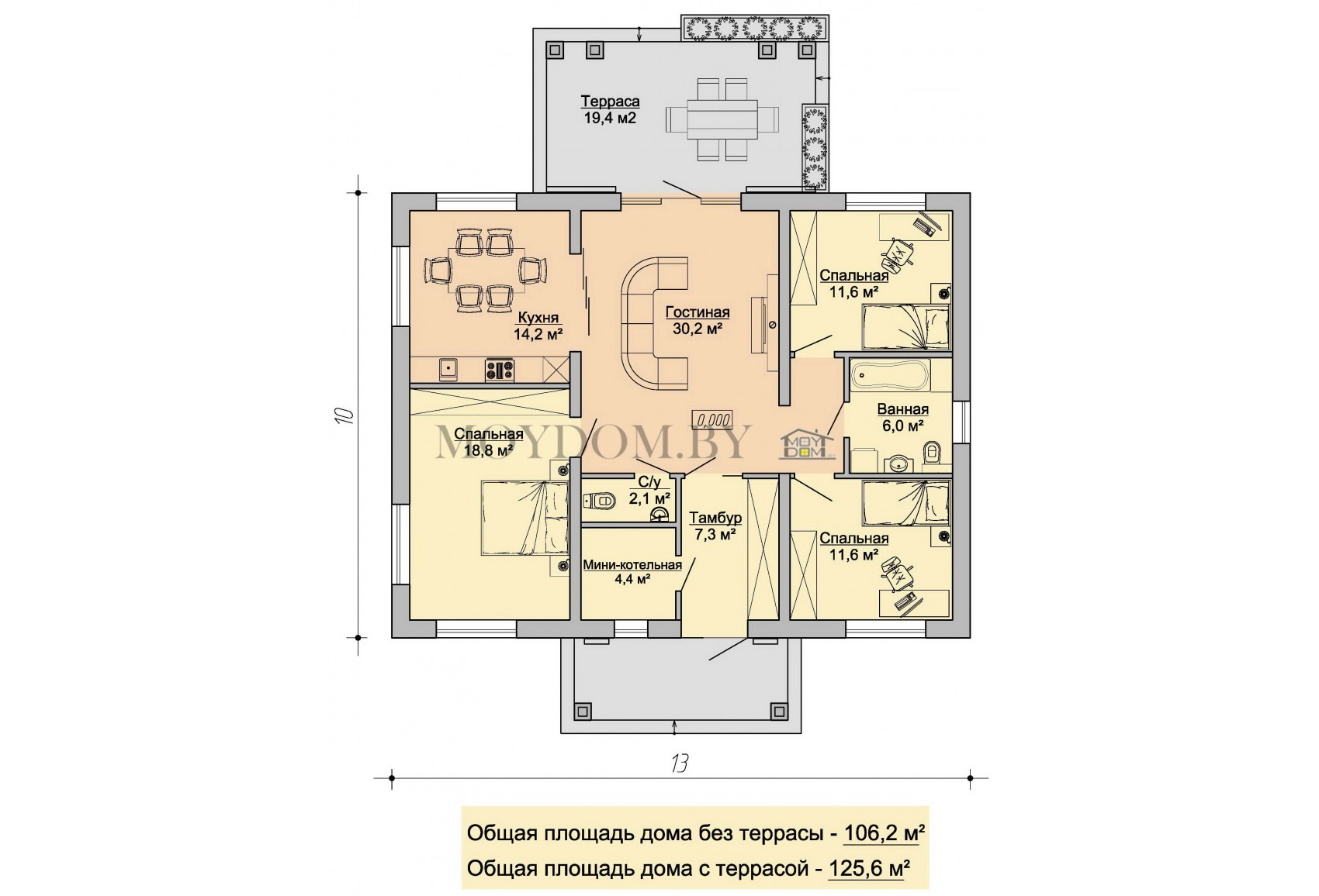 Теги: 10 на 13, от 80 до 150 кв.м., с двускатной кровлей, 3 спальни, второй свет, с террасой, для дачи, эконом, бюджетный, недорогой.