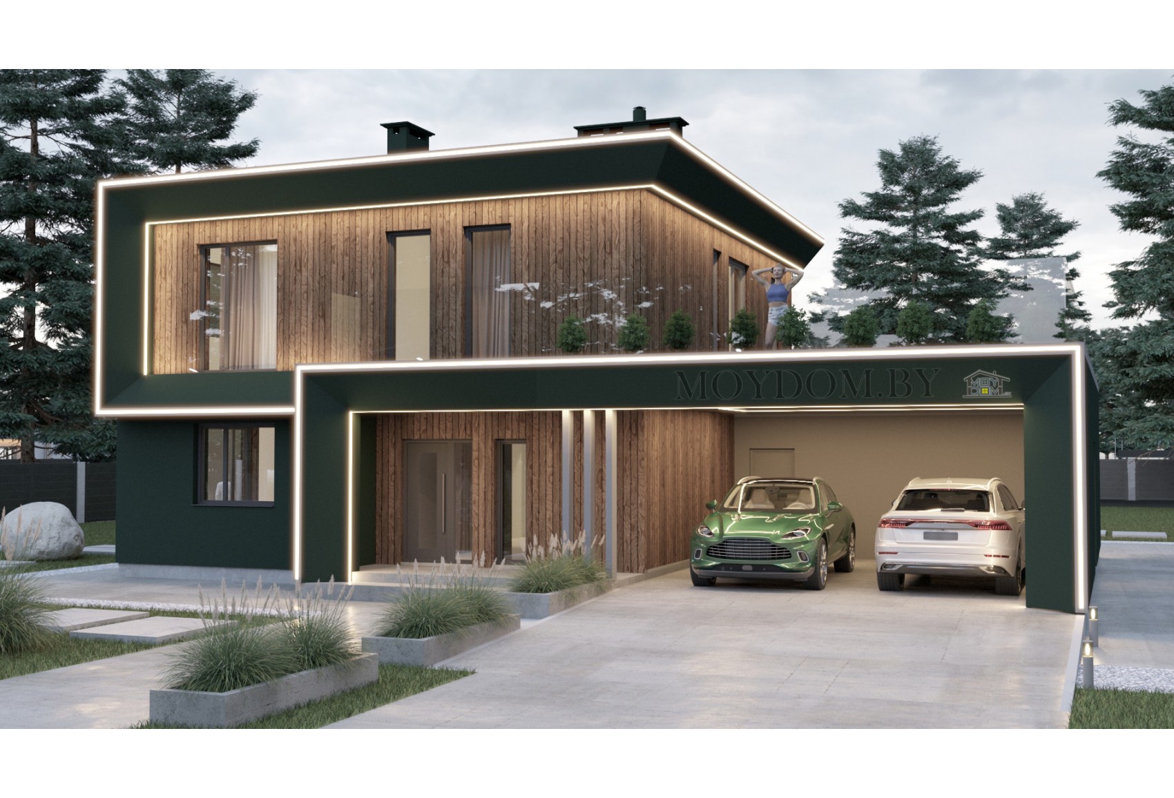 Проект 1131: двухэтажный современный дом в стиле хай-тек с навесом на две машины