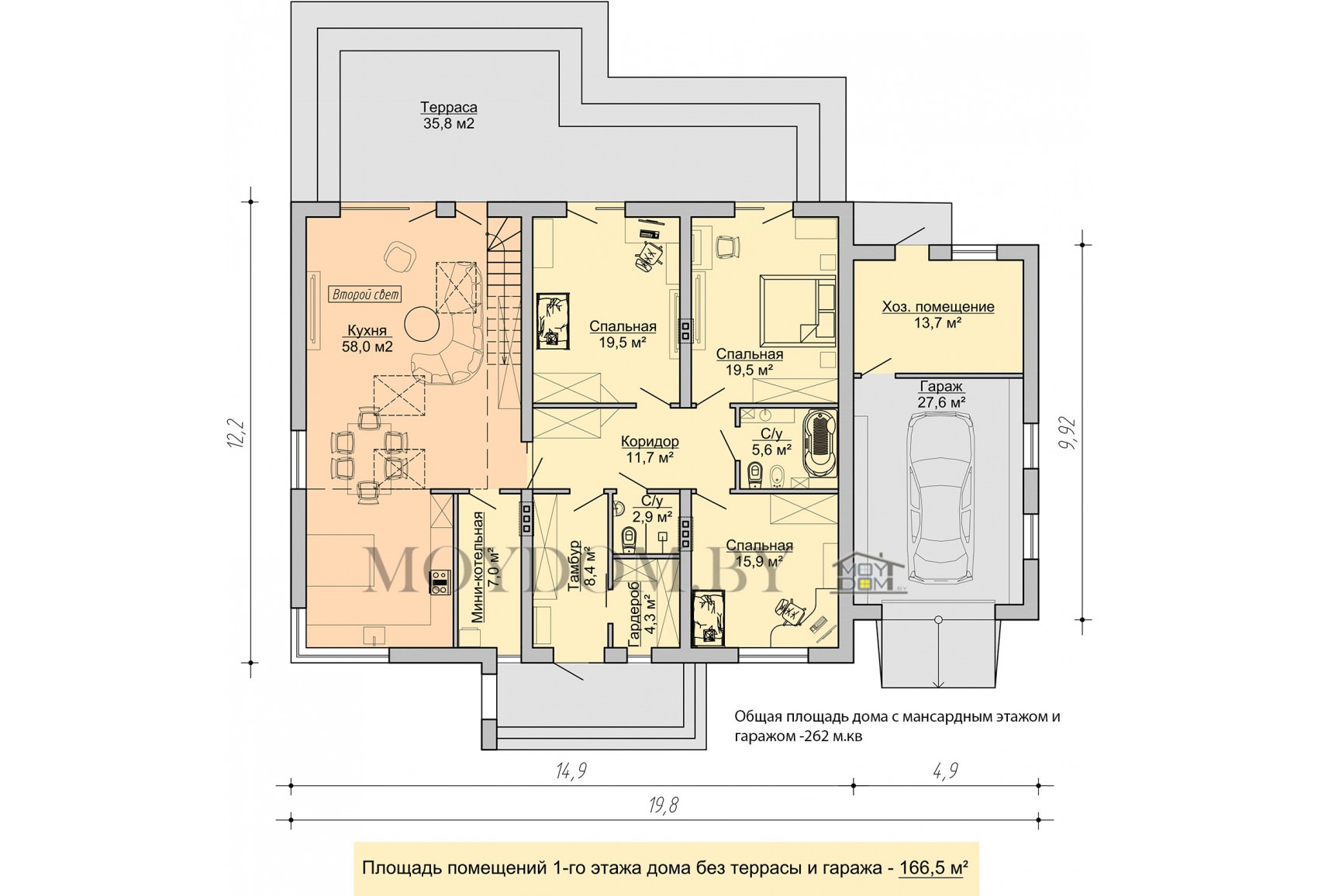 Теги: Серия проектов домов 243, с террасой, с 4-х скатной кровлей, второй свет, топ, 3 спальни, 4 комнаты, современный, с гаражом, с мансардой, 12 на 15, от 150 до 200 кв.м., с кабинетом, со 250 кв.м.м хозпомещением.