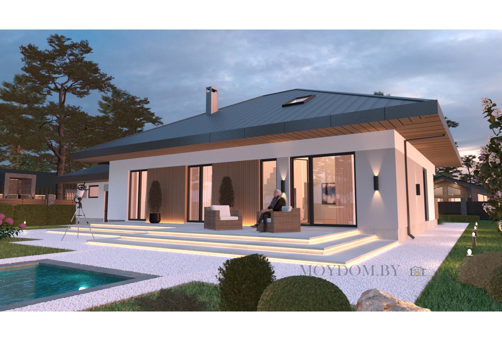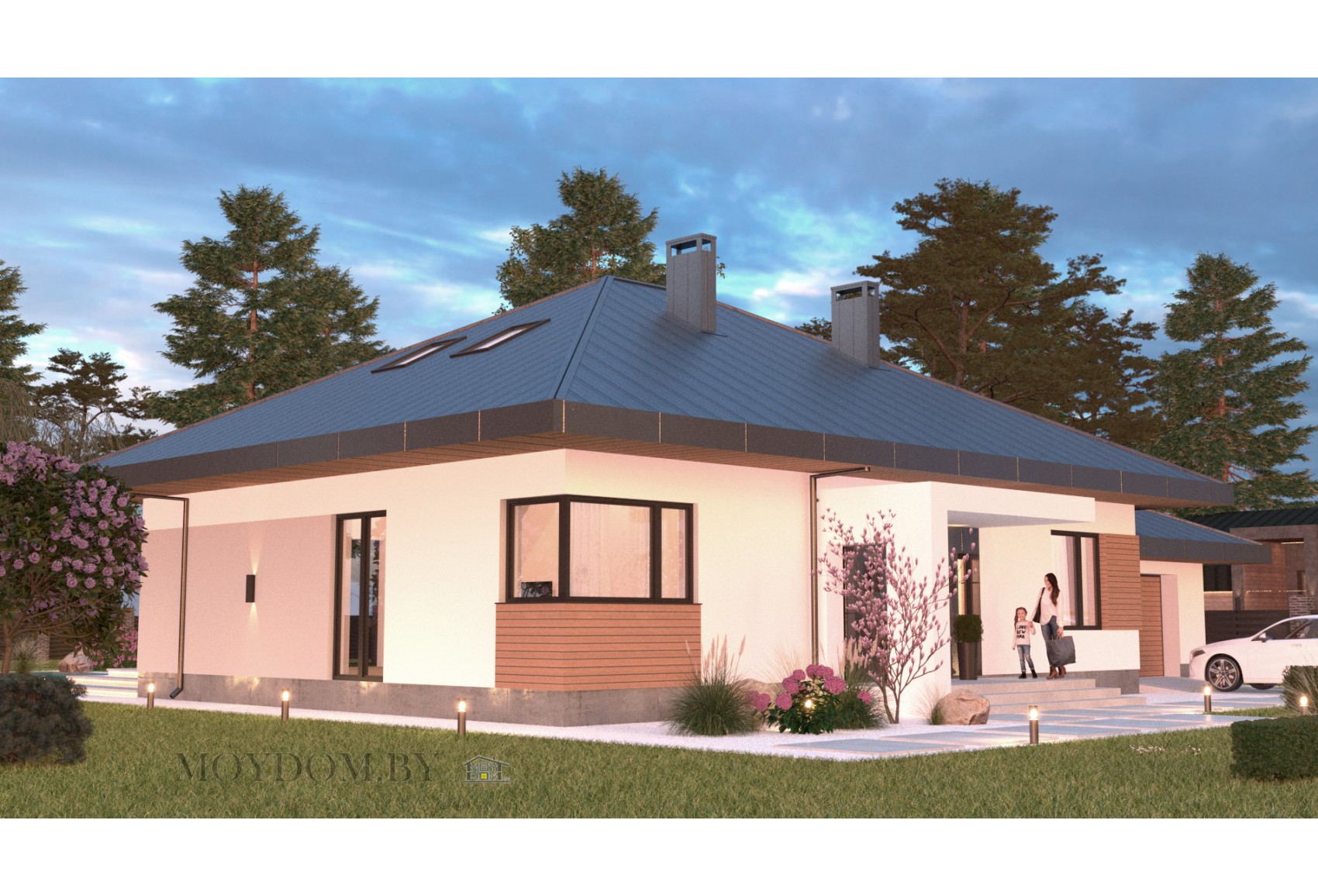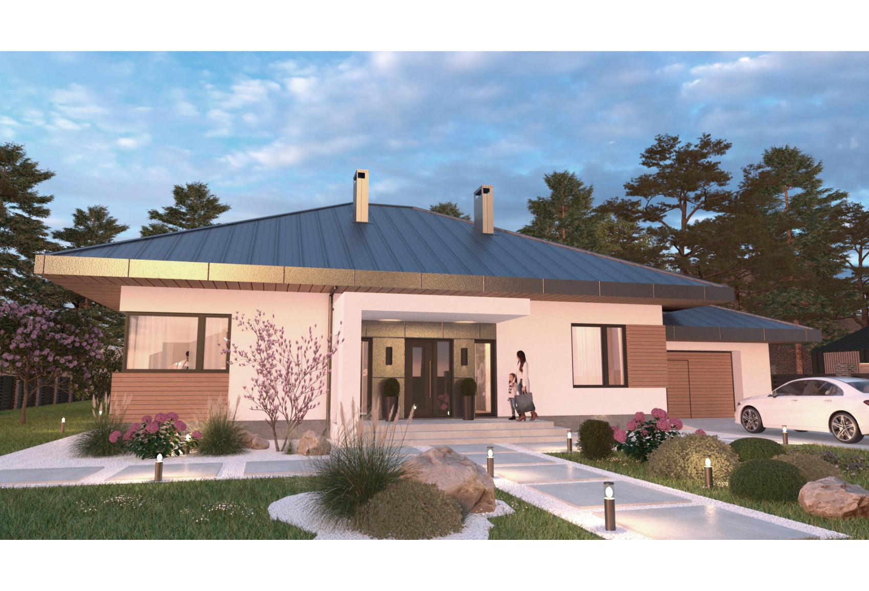 Проект современного одноэтажного дома с гаражом и вторым светом