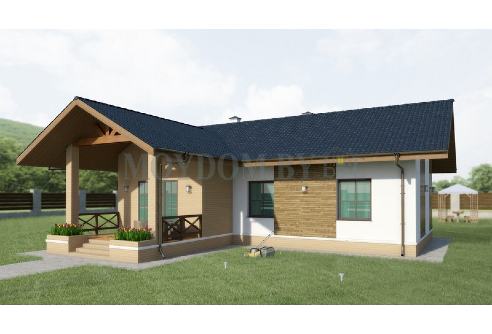 Теги: до 100 кв.м, 10 на 14, 3 спальни, с террасой, дачный, с двускатной кровлей, современный, небольшой, недорогой, компактный, бюджетный.