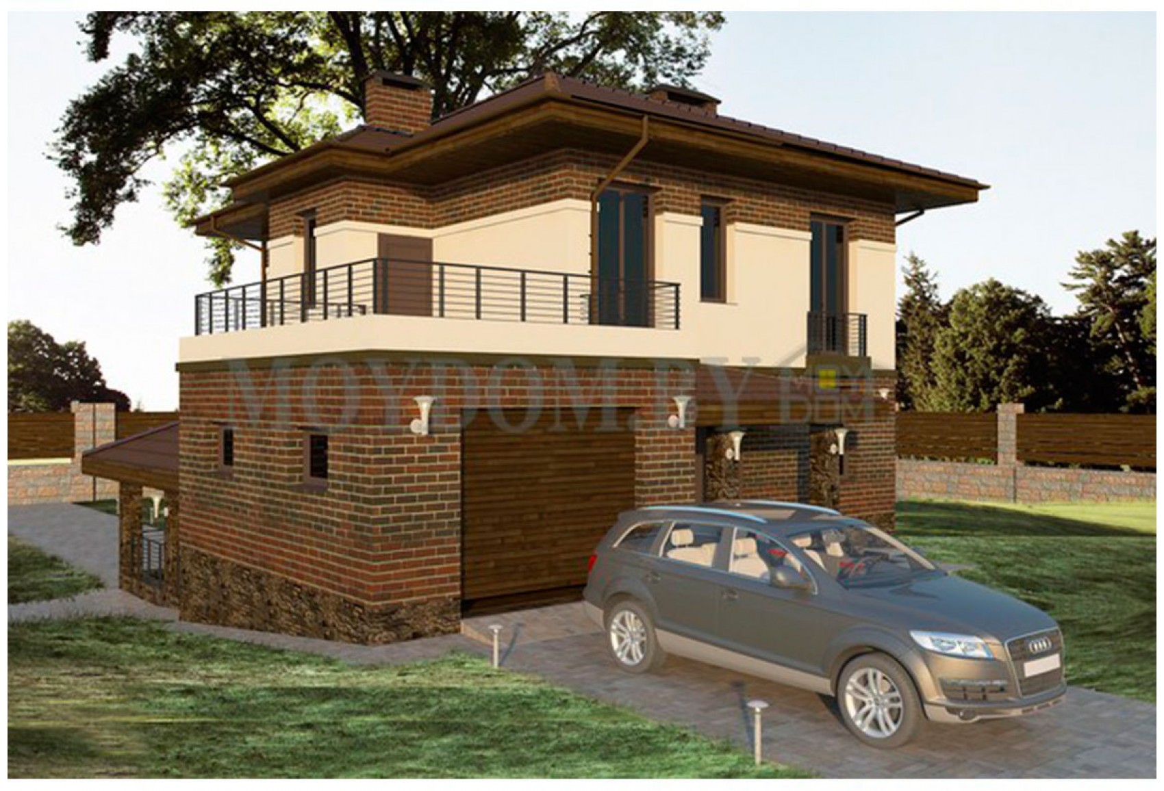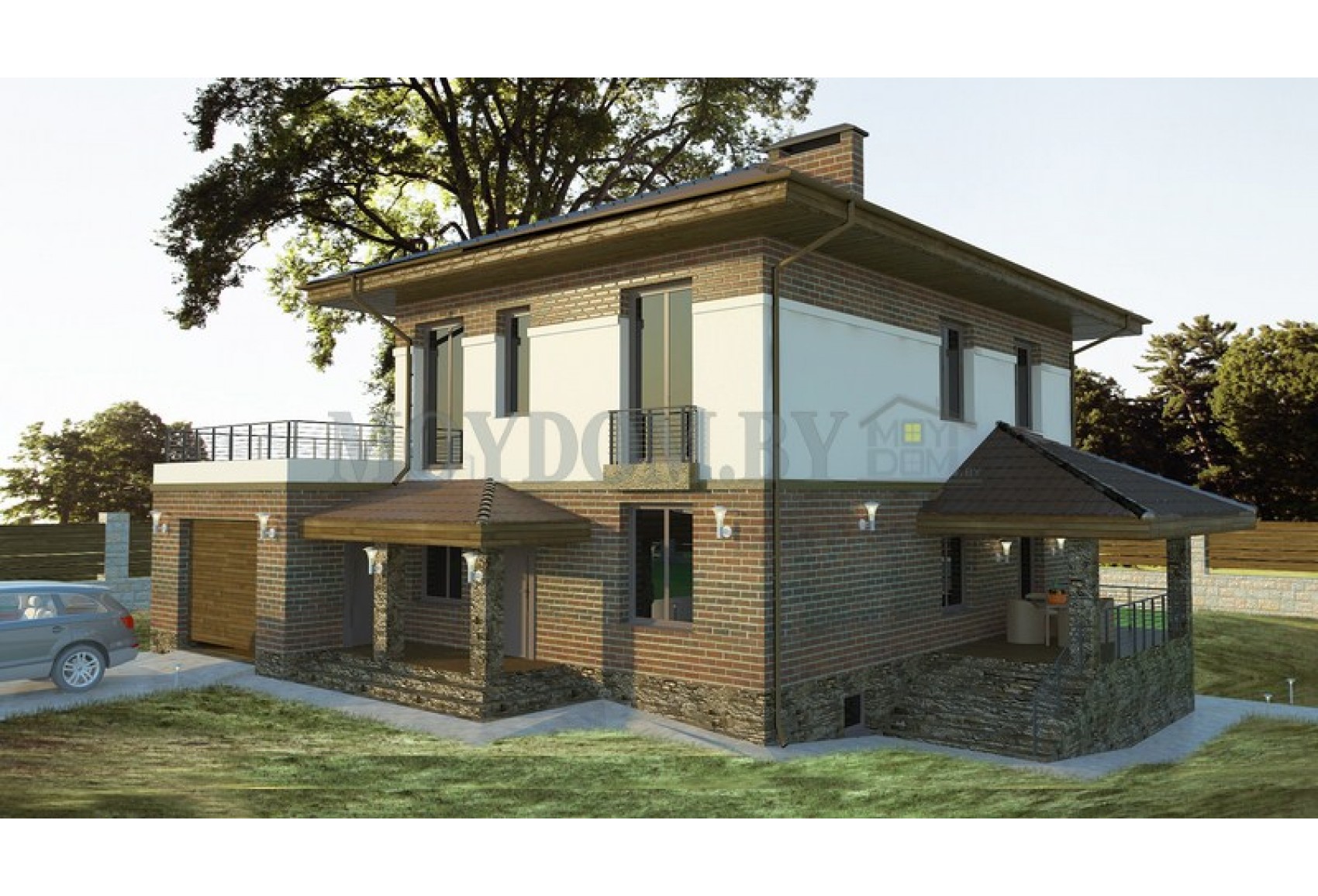 Этот проект дома подойдёт для участка с перепадом высоты от дороги порядка 1 метра. Поскольку дороге свойственно расти от 40 см при укладке асфальта и выше, а привозить и насыпать на участок грунт не очень хочется, то этот проект подойдёт практически всемоект двухэтажного. А примечателен проект двухэтажного дома 313 наличием подвала и гаража. Подвал можно обустроить по собственному усмотрению. Гараж на одну машину имеет выход на террасу с главным входом в дом. На первом этаже расположен кабинет, который при необходимости может стать спальней. Второй этаж вмещает три спальни, общие ванну и гардеробную. Над гаражом предусмотрена небольшая мансарда свободной планировки.