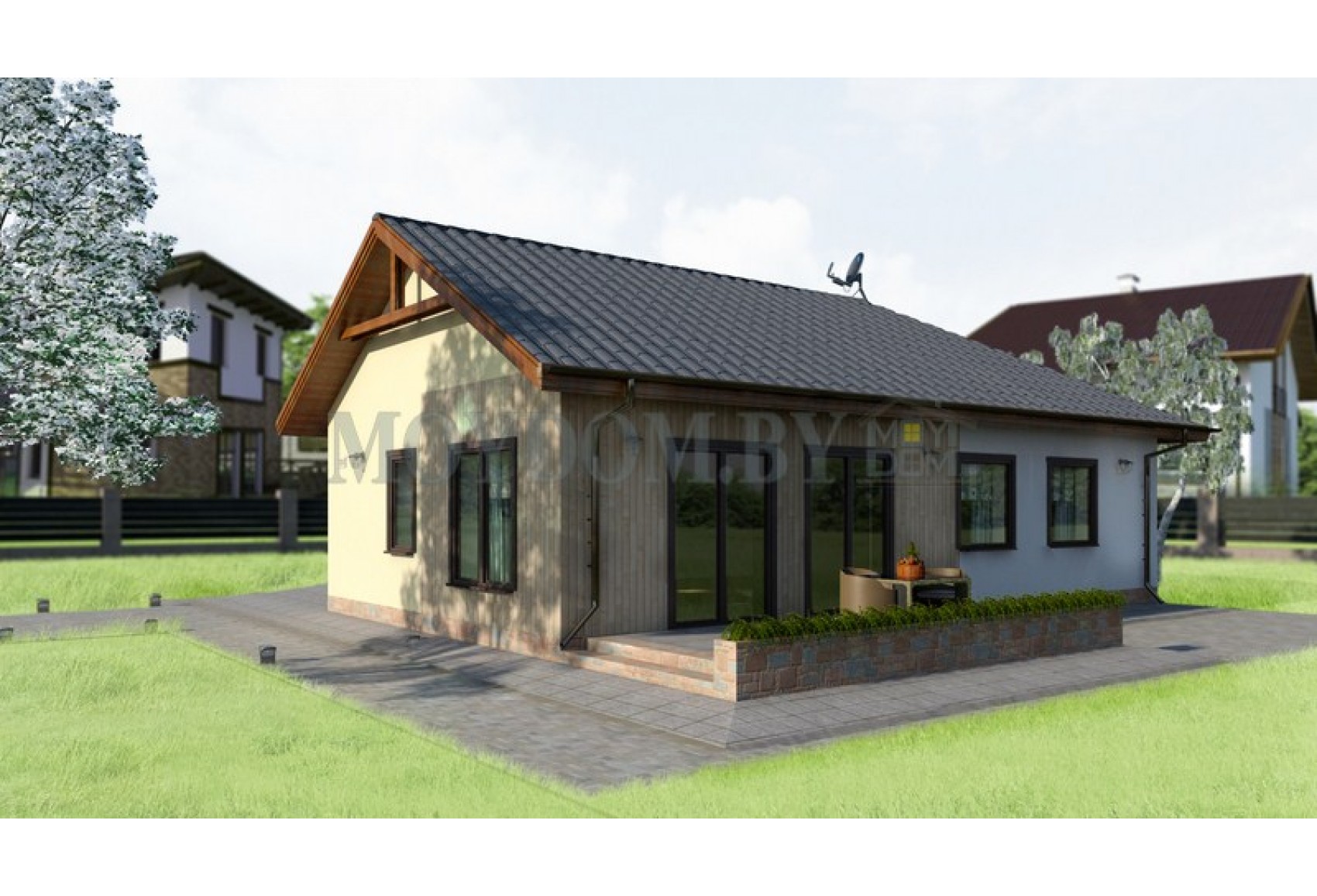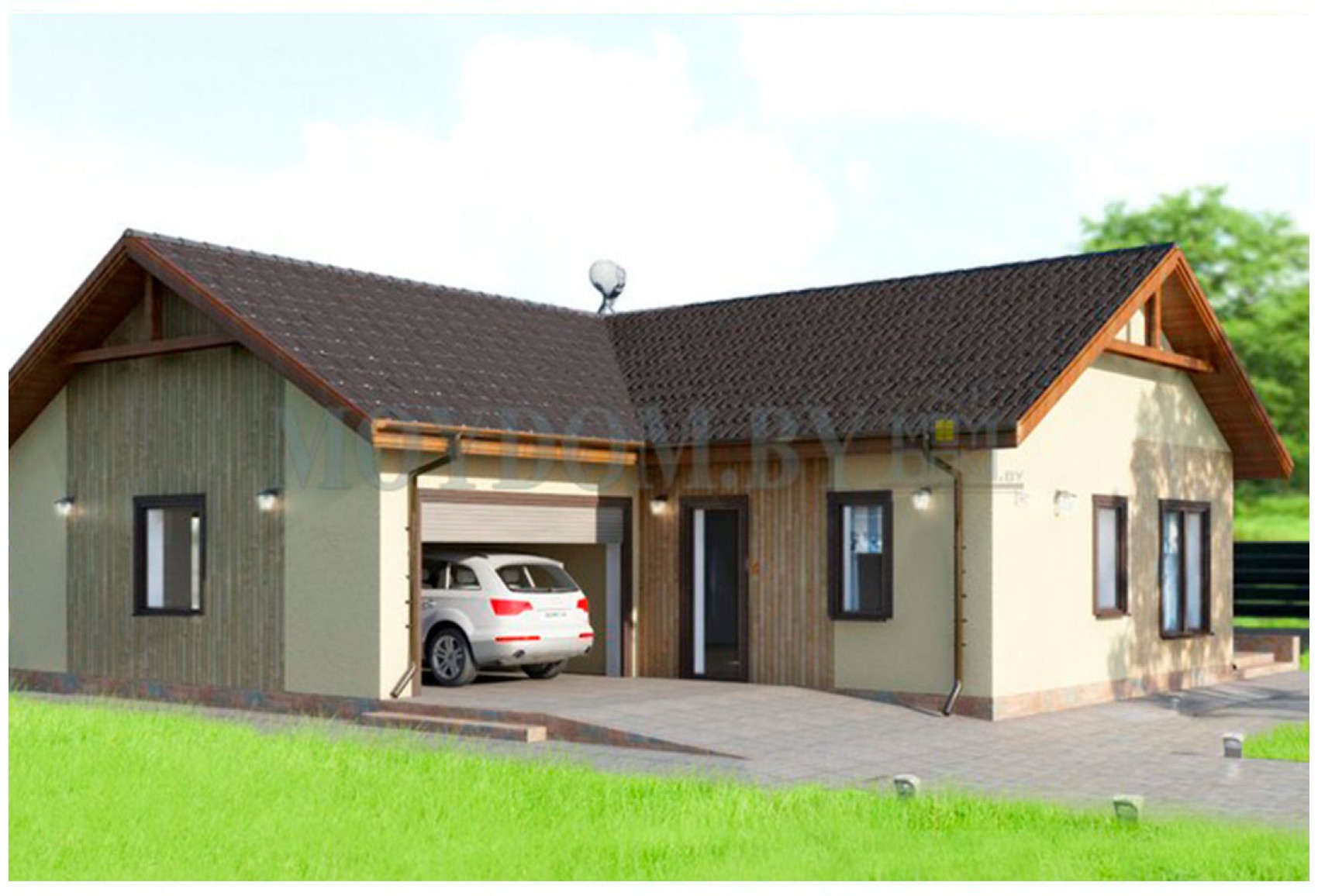 Компактный одноэтажный дом с тремя жилыми комнатами и гаражом. Такой одноэтажный дом отлично впишется в окружающую застройку, в нем с удобством и комфортом могут жить несколько человек. В доме есть 3 спальни, большая гостиная-столовая, топочная и гараж. К гаражу примыкает хозпомещение, что очень удобно. Он очень удобен, хотя у него и небольшие габариты. Этот одноэтажный дом будет отлично смотреться и впишется как в городской, так и загородный ландшафт.