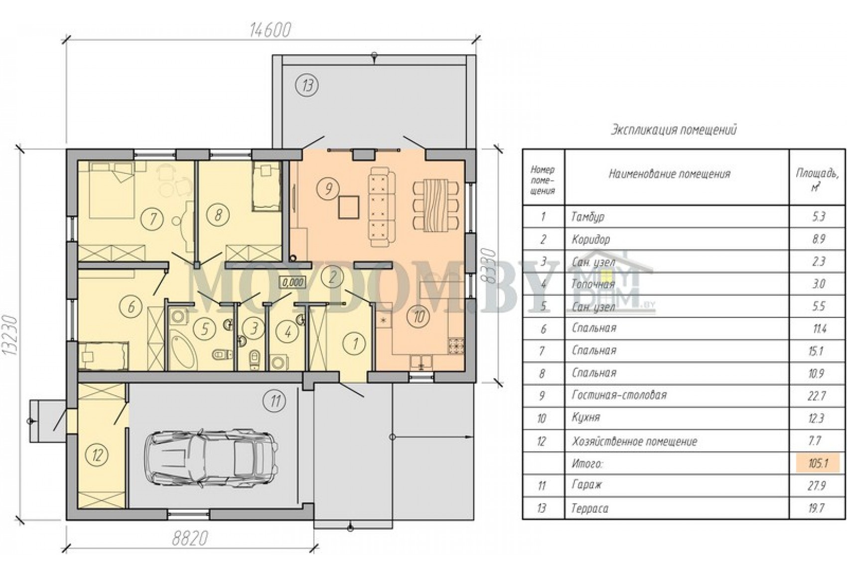 | Общая площадь, м.кв. | 105,1 дом + 27,9 гараж |