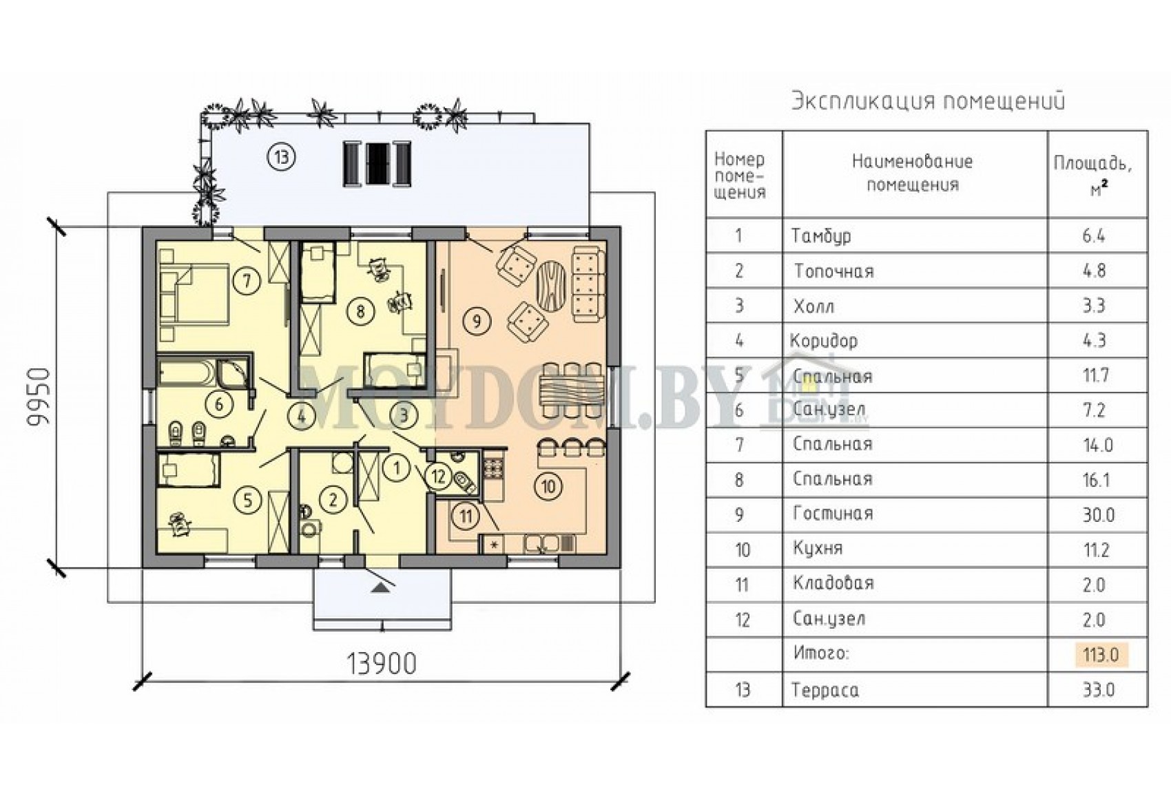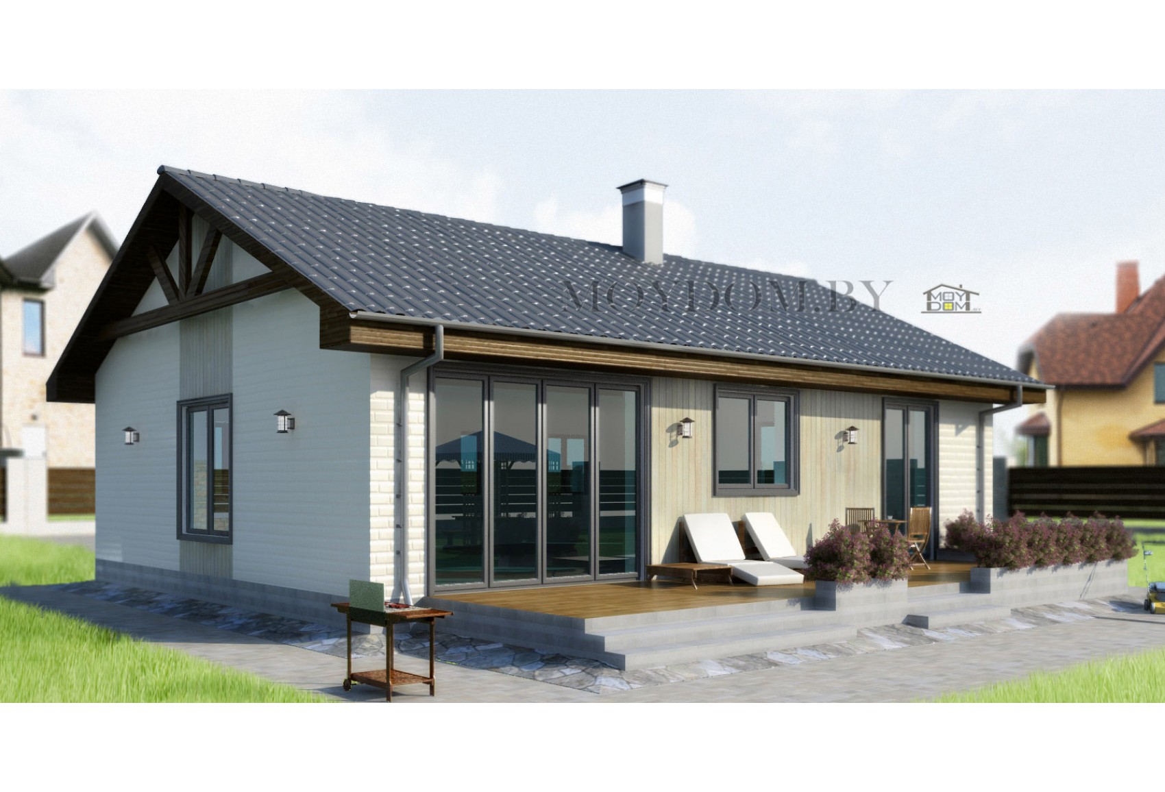 Проект дома №395 - это компактный одноэтажный дом с тремя жилыми комнатами, просторной кухней и гостиной (11,2 кв.м. и 30 кв.м.). Площадь дома позволяет комфортно жить в нем круглый год со всеми удобствами. Отличительная особенность этого проекта дома в том, что над гостиной организовано бесчердачное пространство, а это значит, что потолок в гостиной является низом кровли. Просмотрев наш каталог готовых проектов домов вы можете найти много интересным и практичных проектов одноэтажных домов.