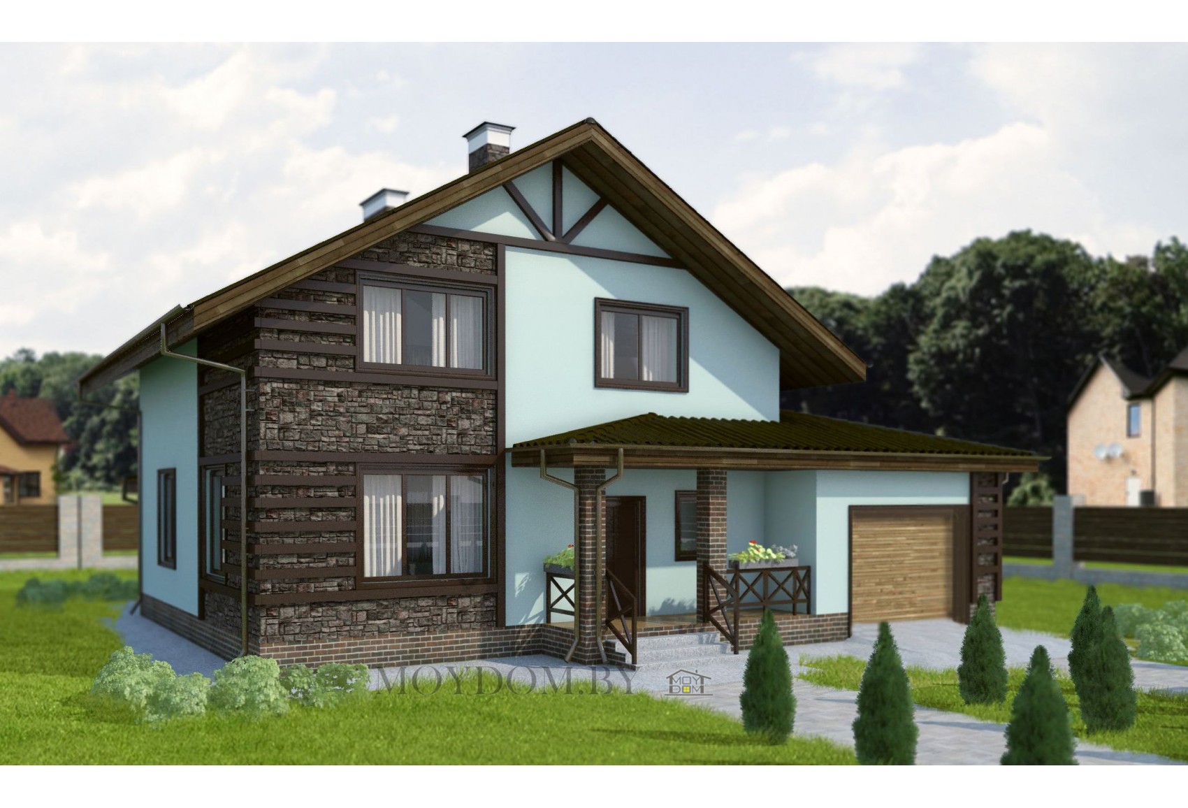 Этот проект мансардного дома создан на основе легендарного проекта дома №268, самого красивого дома с мансардным этажом. Изменения в проекте коттеджа видны невооруженным глазом: модернизирован внешний вид, пристроен гараж. Получилось очень даже хорошо. Наличие в проекте коттеджа гаража требует сегодняшний день, так как большинство заказчиков строится за городом, а, значит, наличие машины обязательно. Половину первого этажа занимает кухня и гостиная, также здесь имеется гостевая комната и санузел. Второй этаж занимают 3 спальни, гардероб и ванная. Из кухни есть выход на террасу. Никаких маленьких и "лишних" комнат в этом мансардном доме нет. Все комнаты светлые и просторные.