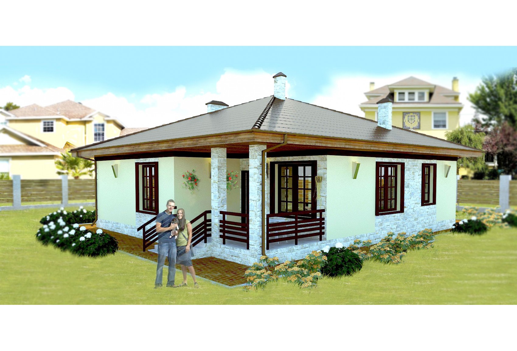 Этот проект одноэтажного дома с эркером и тремя спальнями имеет довольно удобную и компактную планировку. Кухня (в данном случае – это единое пространство с гостиной) – занимает достойных 50 м.кв. Несмотря на общее пространство, зоны кухни, столовой и гостиной чётко разделены. В доме есть два санузла, полноценная гардеробная, мини-котельная, три спальни, в общем всё, что нужно для комфортного проживания семьи из 3-4 человек. Если вы заметили, в кухне предусмотрен эркер – это фишка данного проекта. В других проектах, как правило, в кухне нет такой детали, но здесь мы решили его сделать, чтобы хозяйка на кухне готовила с ещё большим удовольствием и вкладывала эту радость в свои блюда, а члены семьи любовались красивым видом из дома.