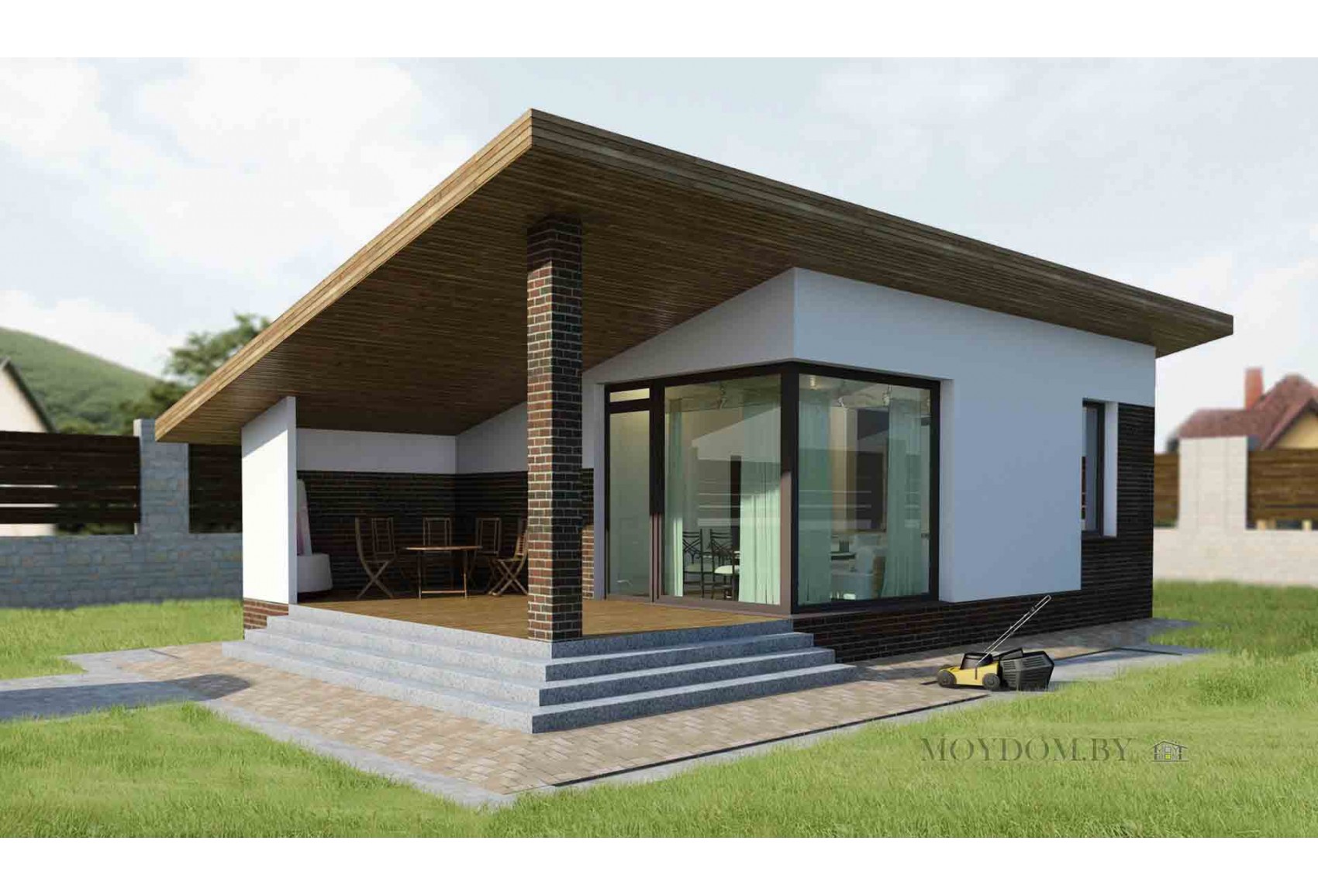 The main plan of the house includes two rooms, a bathroom, a kitchen, a terrace. Thanks to the large windows, there is a lot of light in the rooms. The thoughtful arrangement of the bedrooms helps the owners not to interfere with each other. These projects of houses with a terrace will fit into any landscape design. All these variants of one-story houses are houses with a shed roof. The thickness of the walls in this project is 300 mm, so you can build from any material: gas silicate, wood concrete, expanded clay concrete or brick. The foundation in this project is a ribbed slab. This house does not have an attic, so all the space here is used to the maximum.