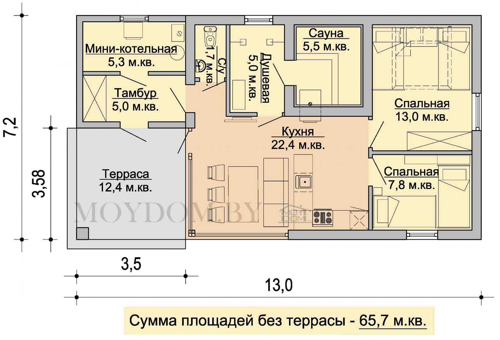 Здесь нет чердака, так как всё пространство – это исключительно полезная площадь. Площадь дома 65,7 квадратов, не считая террасу. Так же предусмотрено место для стиральной машинки в мини-котельной, что сэкономит площадь в самом жилье.