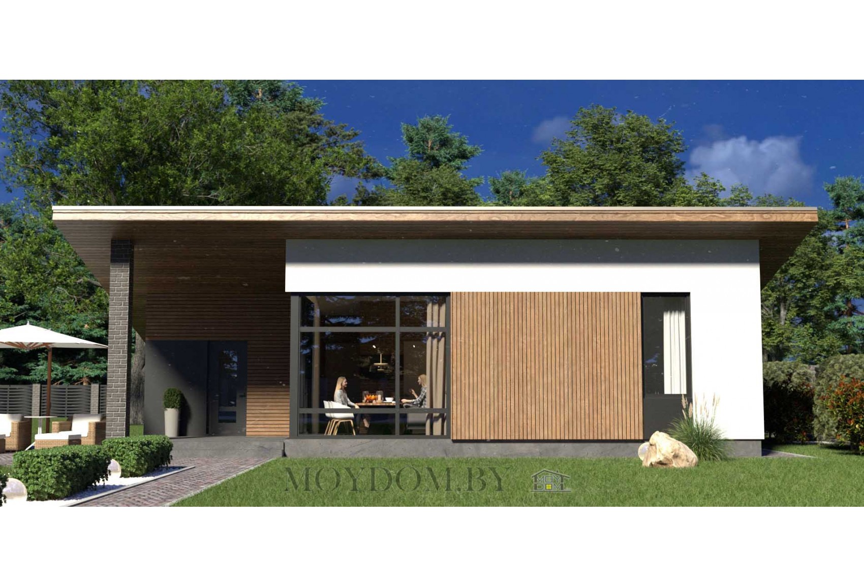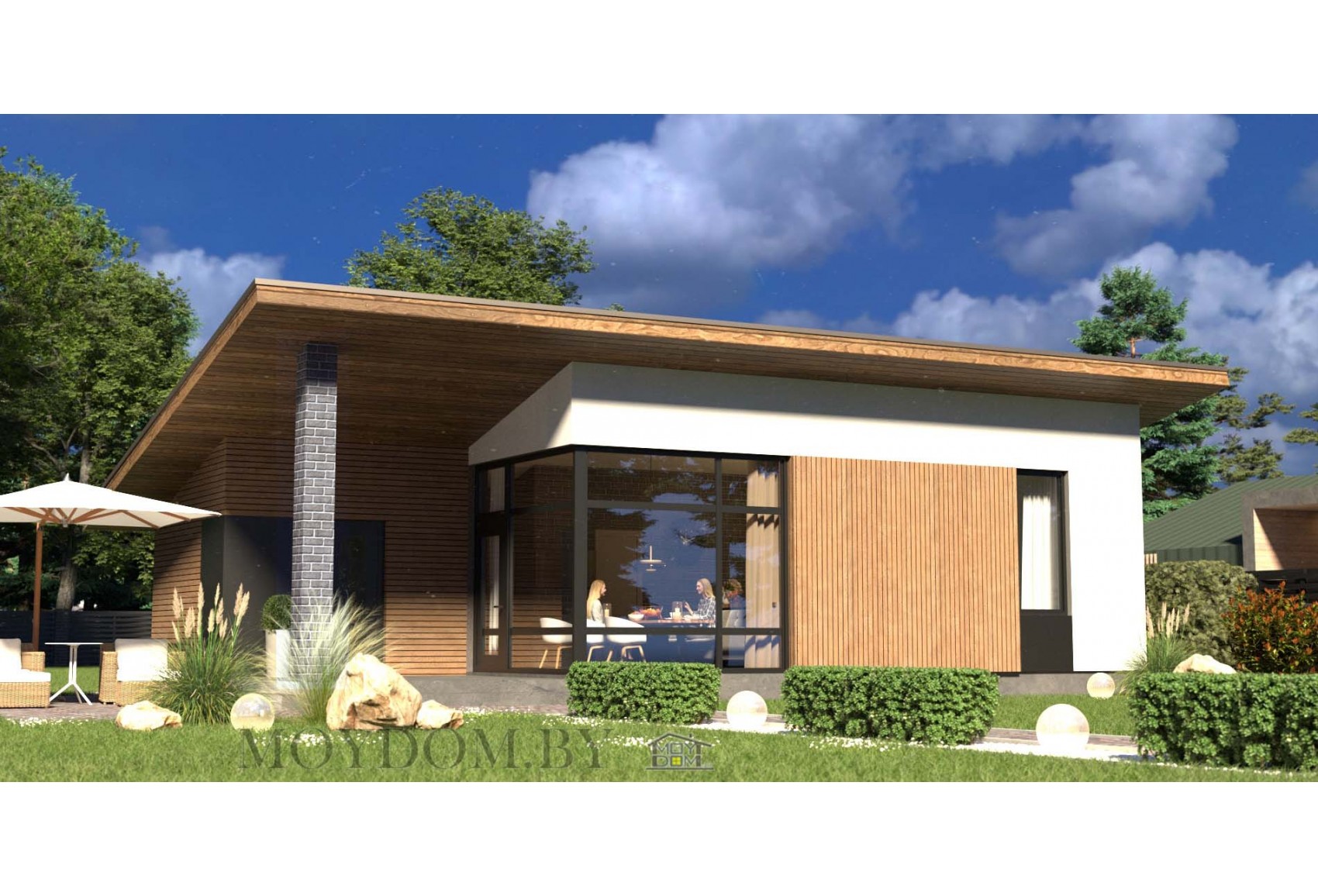 If you need to have time to build a one-story house in 3 years so as not to lose the site due to legal delays, use the modern bath project. Having erected a similar house-bath, you can safely continue to build the main house. The project provides not only a sauna, but also 2 bedrooms, a kitchen, a bathroom and a small outdoor terrace for outdoor recreation. Even from the photo of the bath it is clear that it is not just a building with a steam room, but a completely full-fledged house with everything you need. The house-bath can serve as a summer cottage or a guest house - after all, there is everything you need for a comfortable pastime. The building will last for many years, so this is a great investment for you and your loved ones. If desired, a turnkey built bathhouse can be easily sold, because many people want to buy a small but cozy comfortable country house.