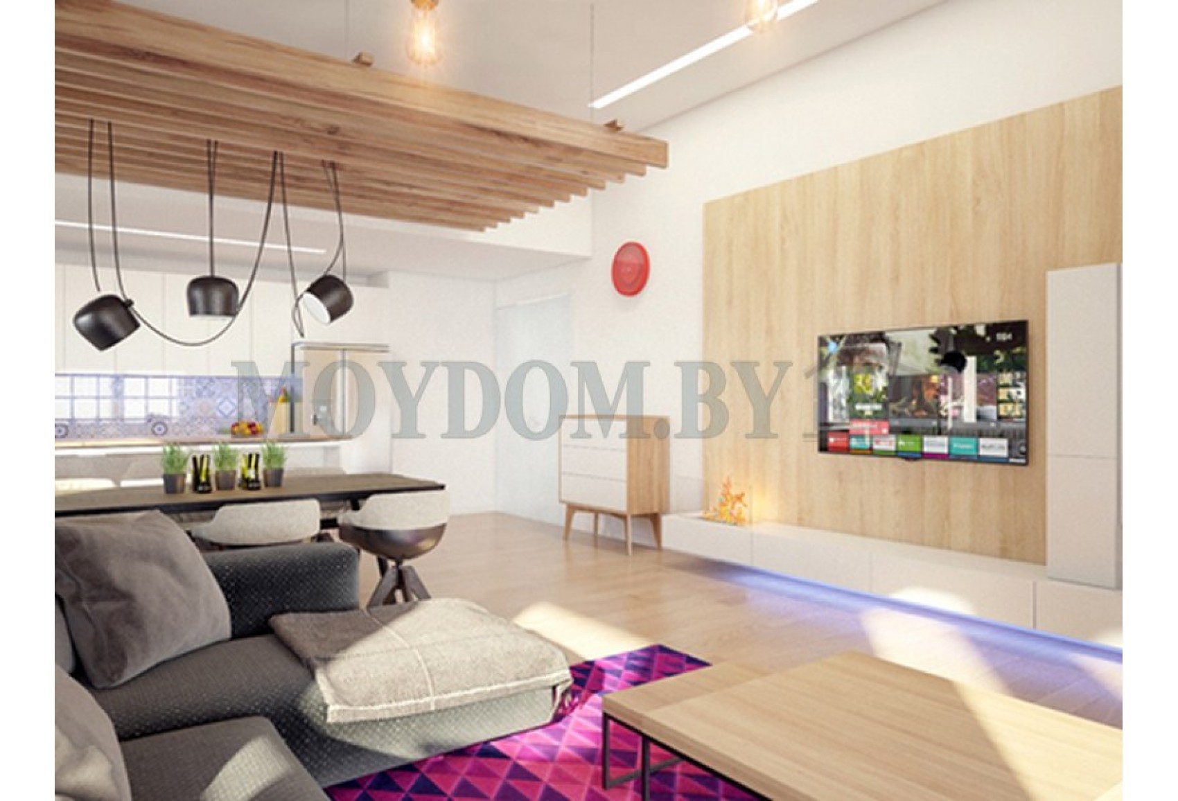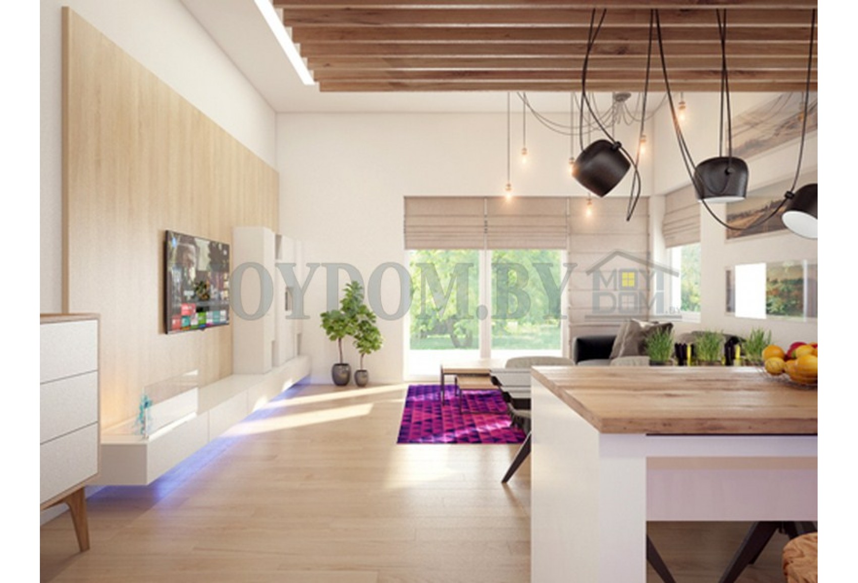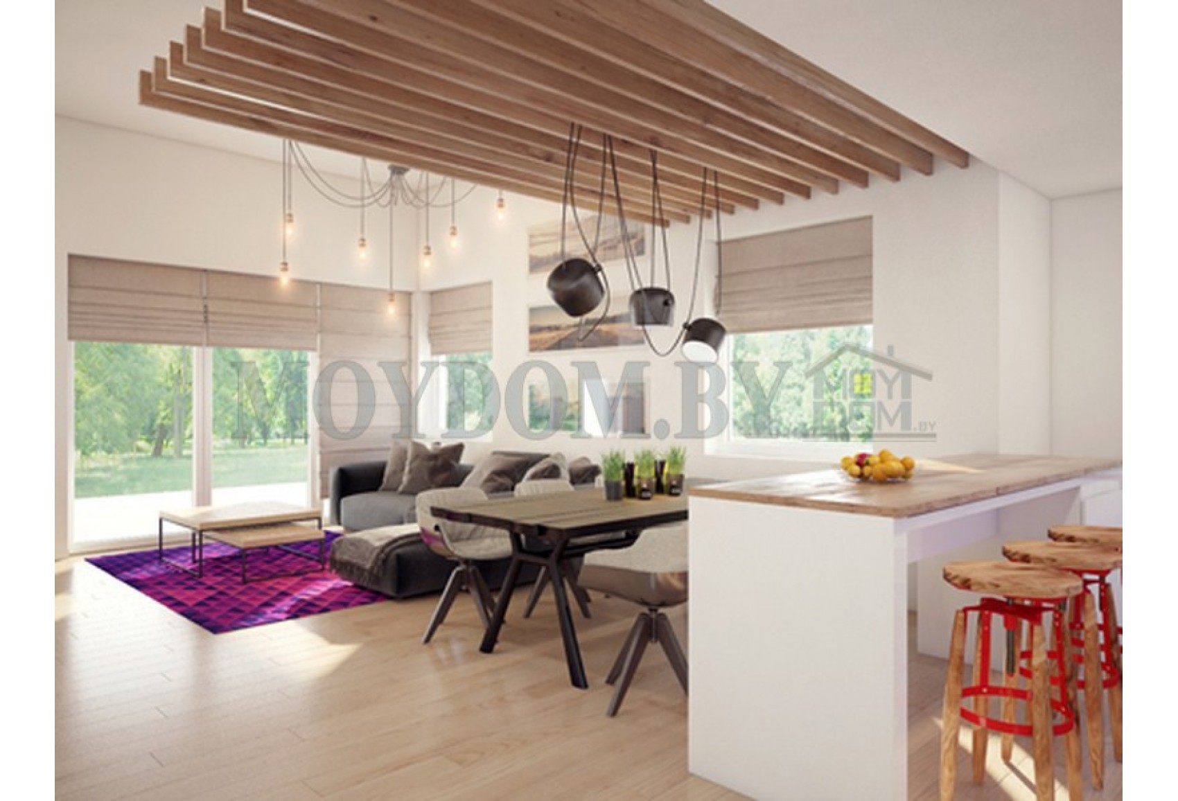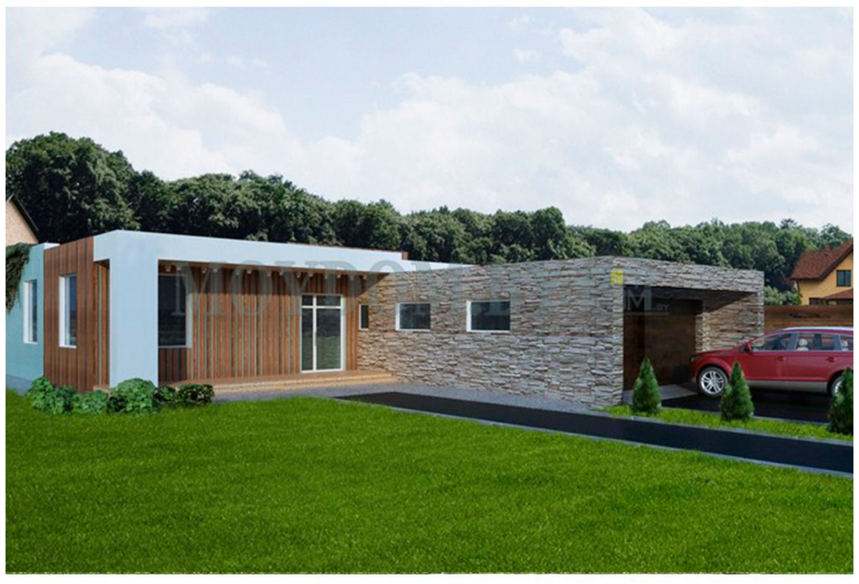 Отличный добротный современный проект одноэтажного дома с плоской крышей и большим гаражом на 2 машины. Гараж в проекте коттеджа вынесен немного вперед, что придает дому некую изюминку. Планировка дома удобная, она включает в себя четыре жилых комнаты, кухню, гостиную, ванную и санузел. Есть прекрасная терраса, навес которой как бы и не пропускает солнце, но и не затемняет пространство под собой. Плоская крыша из современных материалов будет служить долго, она очень прочная. Этот проект одноэтажного дома подойдет как для постоянного проживания, так и как вариант летнего дома, дачи.
