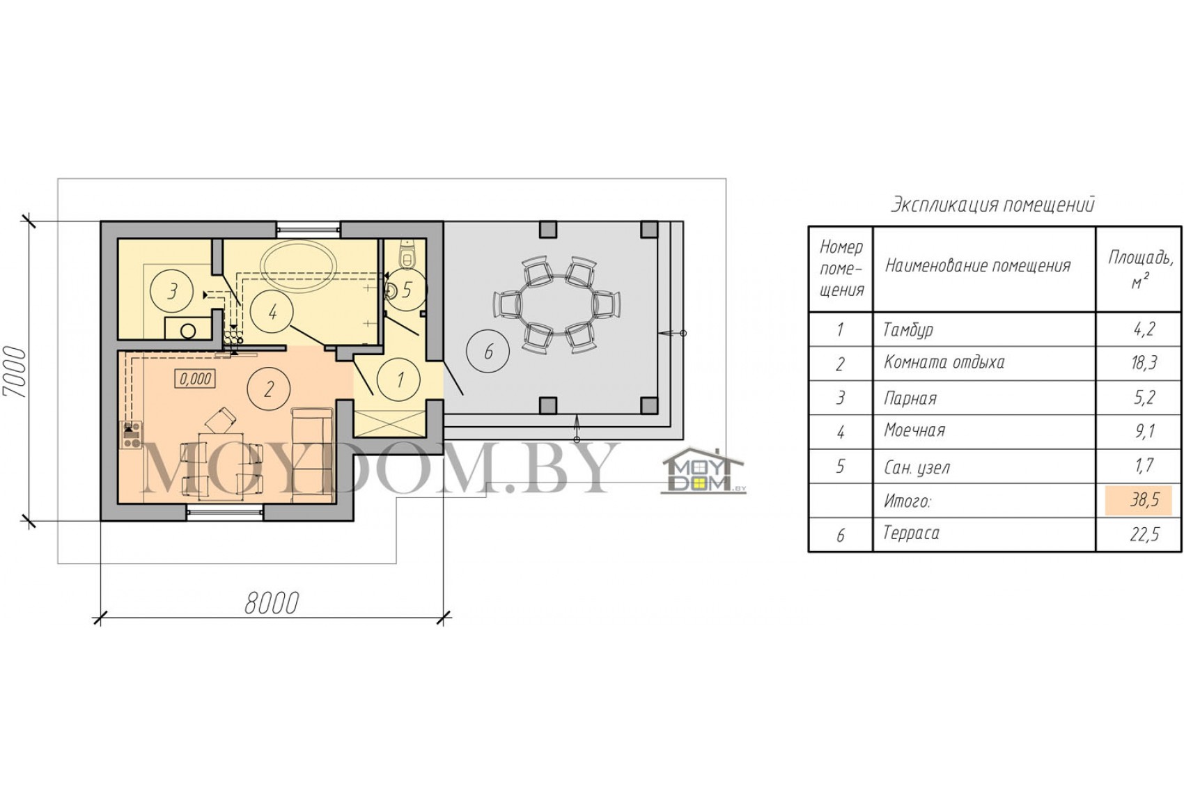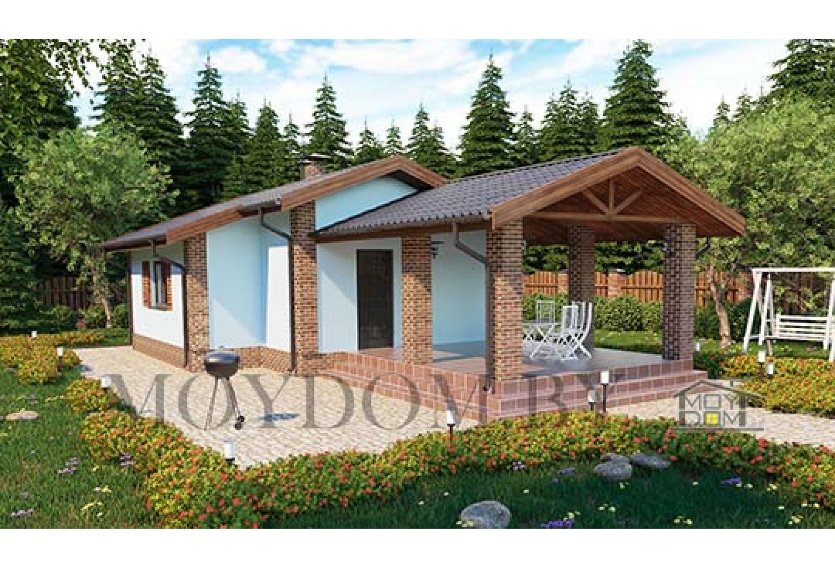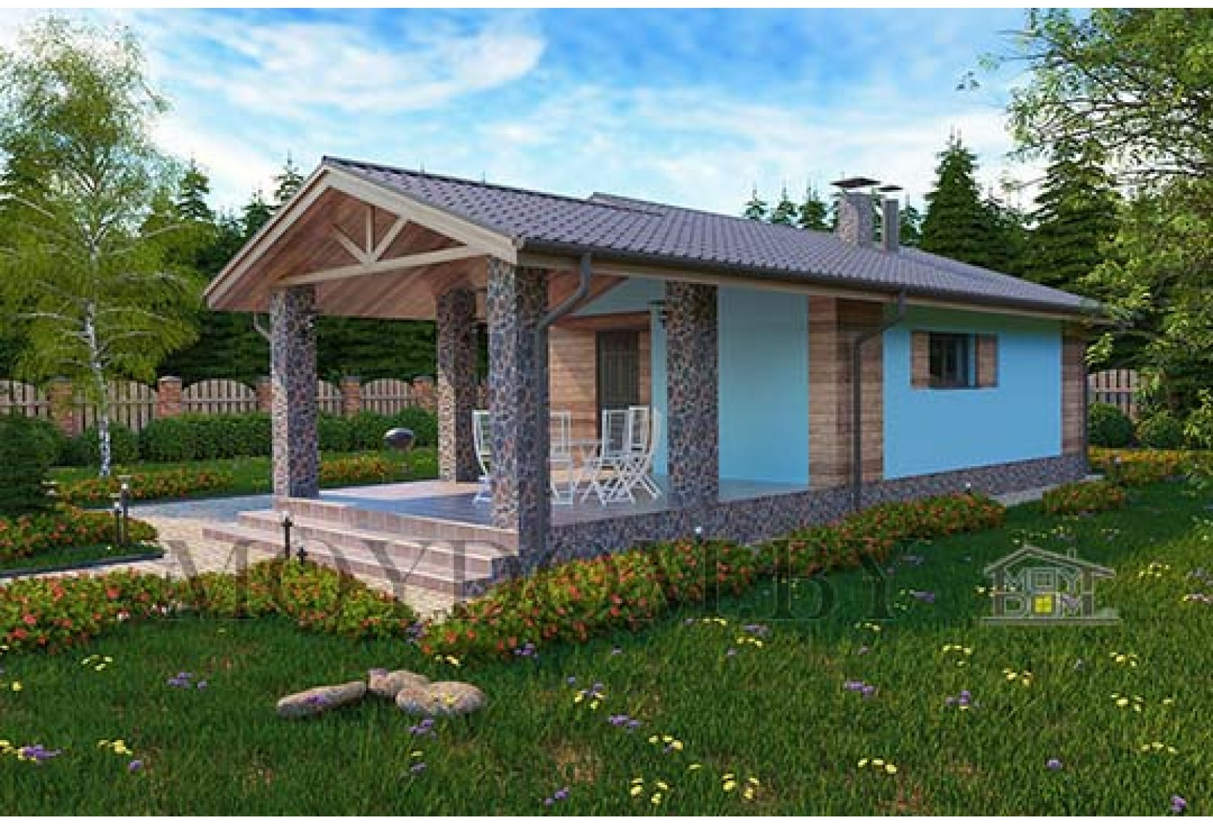 Теги: до 100 кв.м., 7 на 7, 8 на 8, 1 спальня, с крытой террасой, с двускатной кровлей, с баней, с сауной, недорогой, бюджетный.