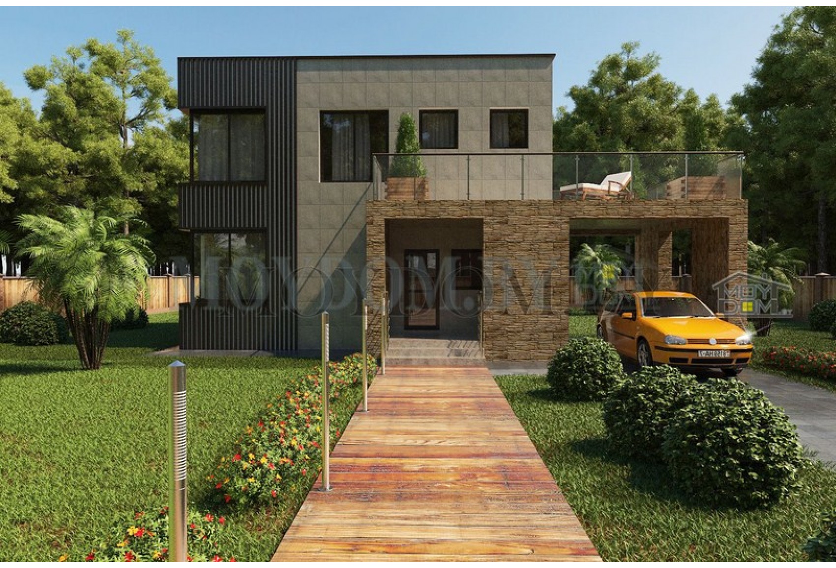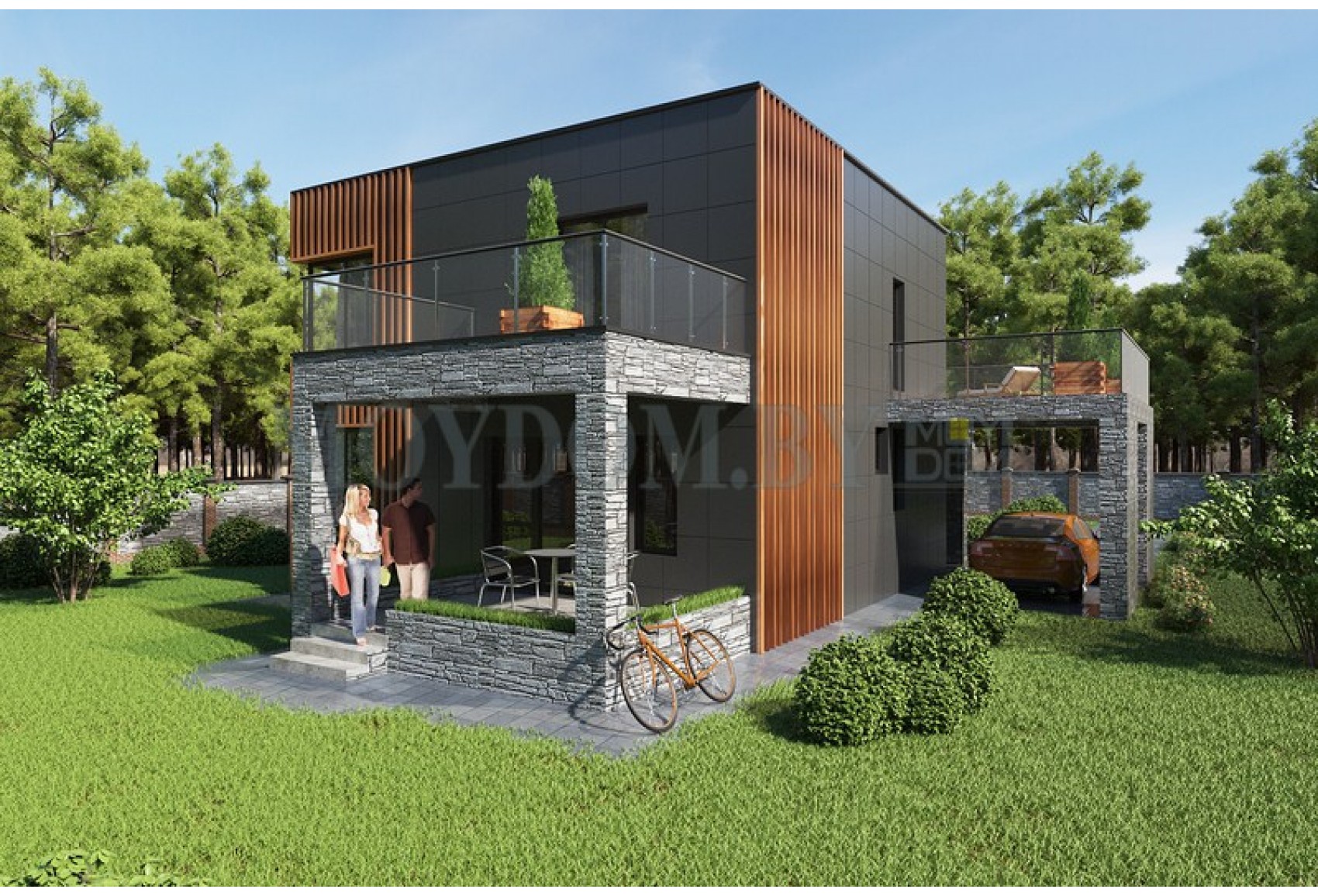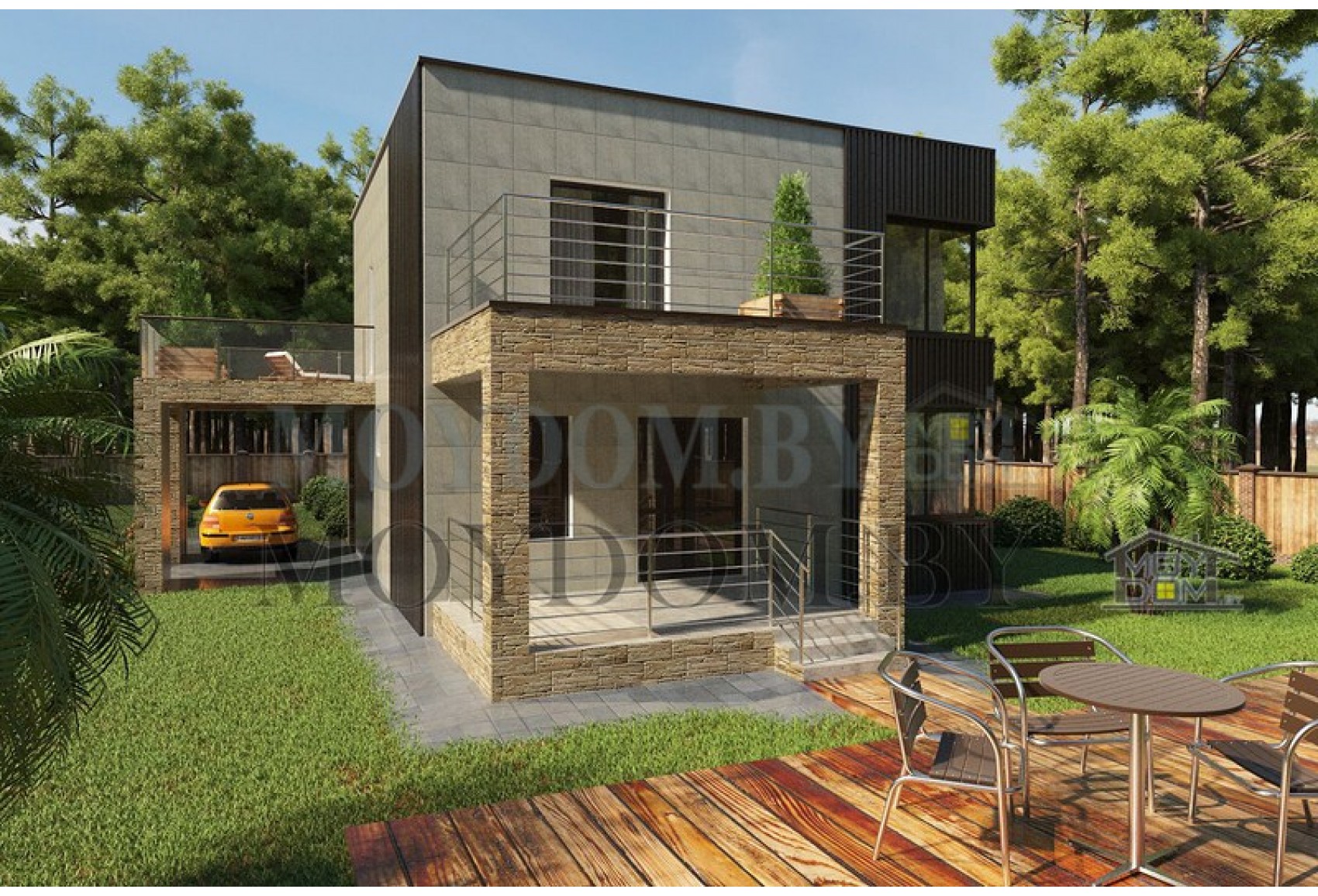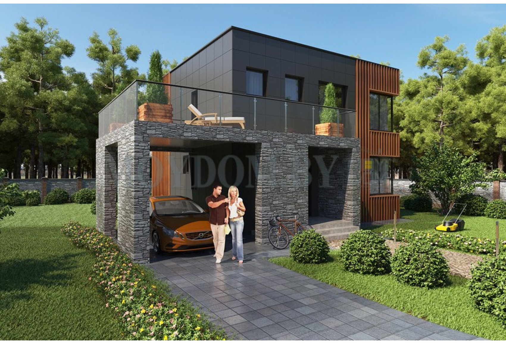 Представляем вам современный проект двухэтажного дома с плоской крышей и навесом в стиле "хай-тек". Это проект дома - "родственник" знаменитого проекта 95, только с плоской кровлей и навесом для машины. В этом проекте сделали смелое решение по цветовой гамме. Рыжие полосы и тёмный фон эффектно контрастируют друг с другом. Фасад навесной, облицован керамогранитом, кстати, весьма сопоставимое по цене решение в сравнении с обычной штукатуркой. За облицовкой находится лёгкий утеплитель толщиной 50 мм. При желании можем внести небольшие изменения в проект двухэтажного дома. Плоская крыша с наплавляемым гидроизоляционным ковром весьма надёжное решение, отработанное годами. Этот стильный двухэтажный дом имеет навес на одну машину, террасу, 2 балкона на втором этаже. Дом очень удобен для постоянного проживания. Кстати, навес можно легко переделать в гараж.