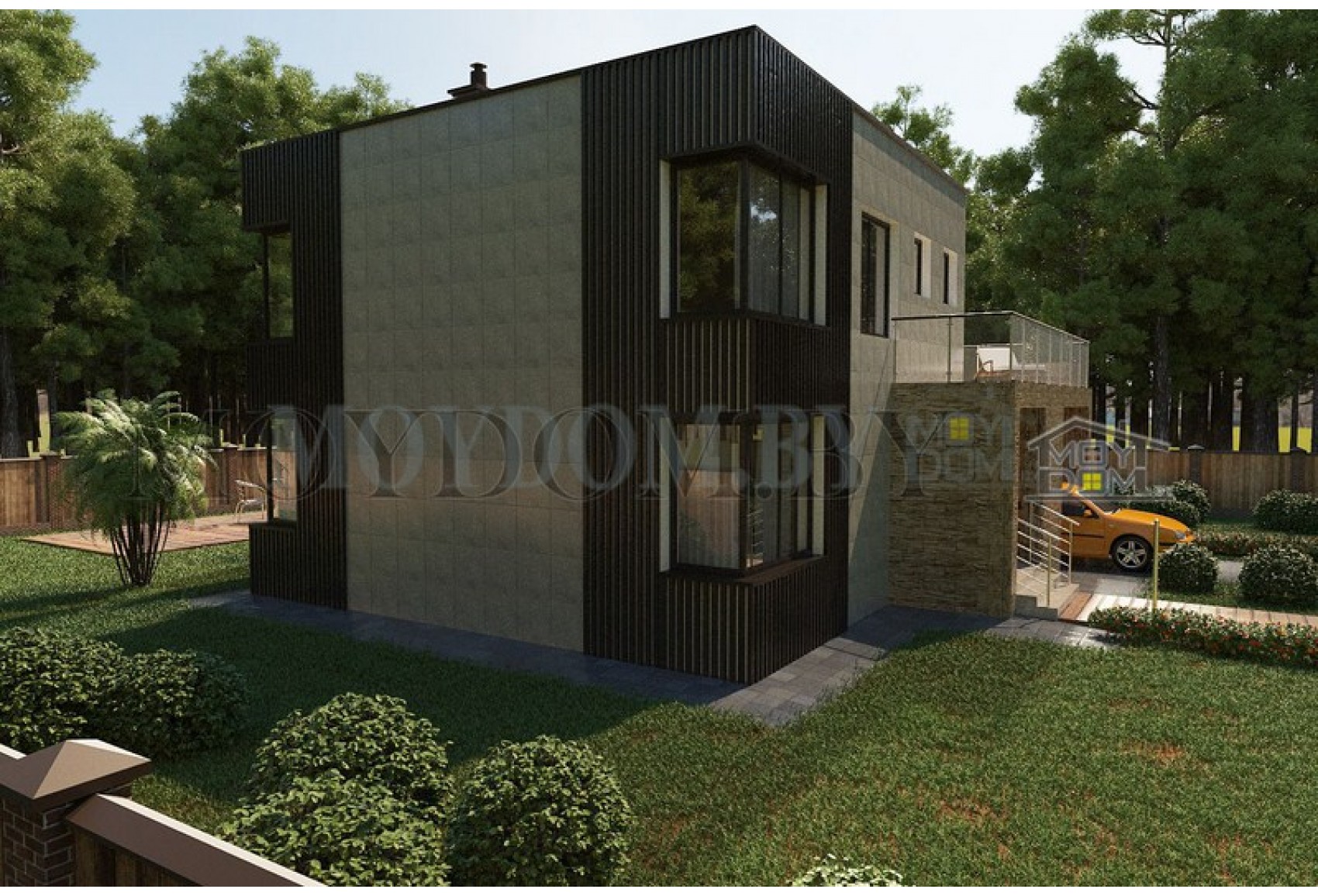 Теги: 10 на 10, от 80 до 150 кв.м., от 100 до 150 кв.м., 4 спальни, 4 комнаты, с плоской кровлей, современный, хайтек, с навесом для машины, с балконом, с террасой, с гардеробной, с постирочной, с угловыми окнами, с панорамными окнами.