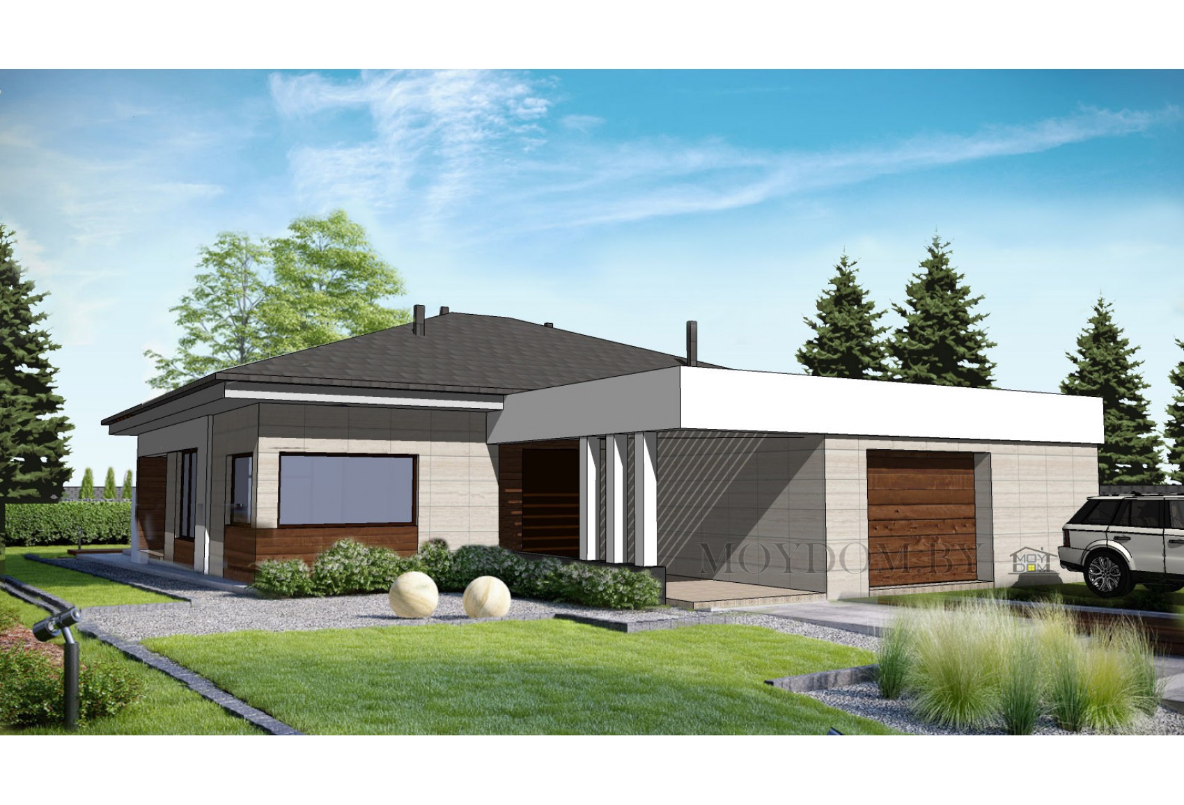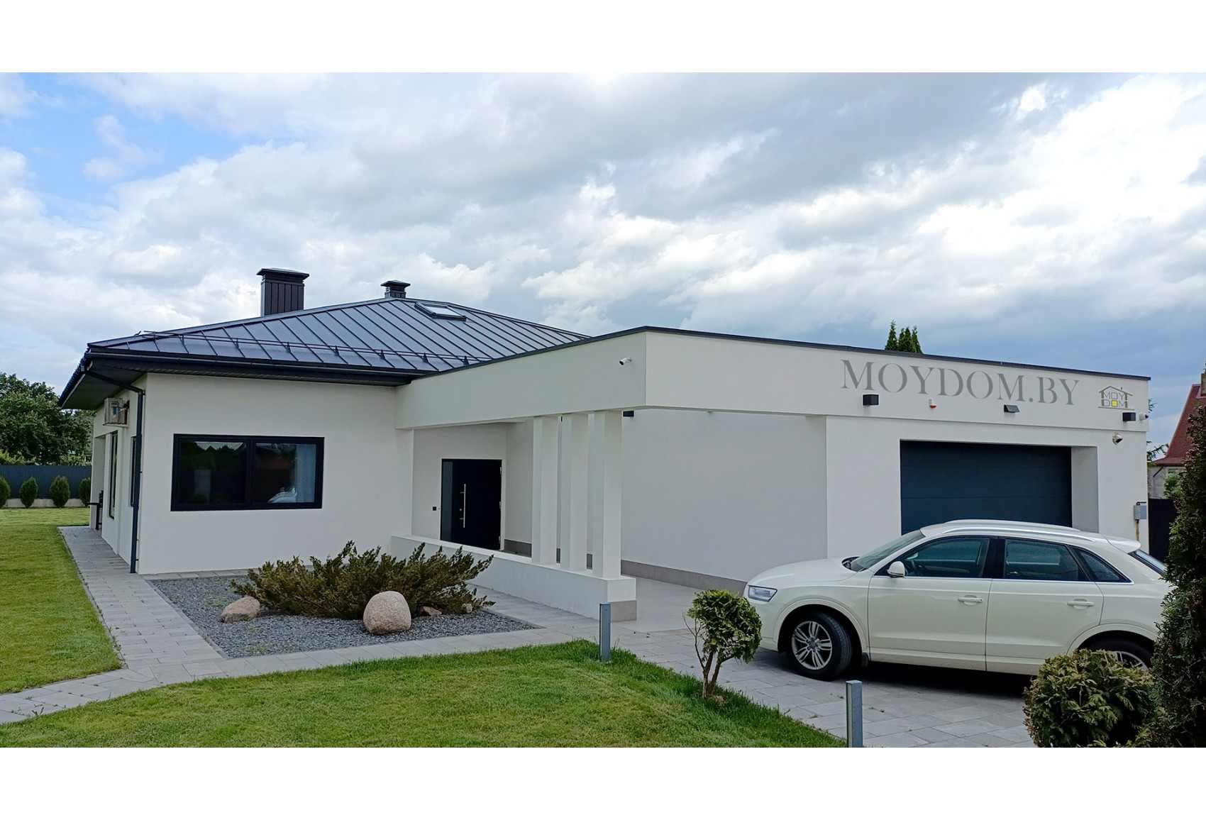 Проект одноэтажного дома с 4 спальнями и большим гаражом. Корни данного проекта растут из польских проектов, но остались похожими, разве что, некие черты внешнего вида, остальное всё в корне отличается. Мы с заказчиком тут всё переделали под себя. Кстати, коробка дома уже стоит, идёт отделка. Один дом находится в г.п. Колодищи (Минский р-н), второй в д.Обчак. Как вы заметили - над гаражом спроектирована плоская кровля. Раньше люди боялись такого решения, однако, со временем страхи проходят и современные технологии берут своё. На террасе предусмотрен второй свет, поэтому в общей комнате не будет темно. Да, решение довольно непростое, но интересное. В доме есть четыре спальни, полноценный гардероб, отдельная мини-котельная, что важно для безопасности, два санузла, постирочная, короче, всё, что нужно для полноценной жизни семьи из четырёх человек, ну, и плюс комната для бабушки с дедушкой, если понадобится. Кстати, в гараже даже предусмотрели место для газонокосилки и прочих садовых гаджетов. Проект классный, поэтому советую долго не думать, а быстрее заказывать его.