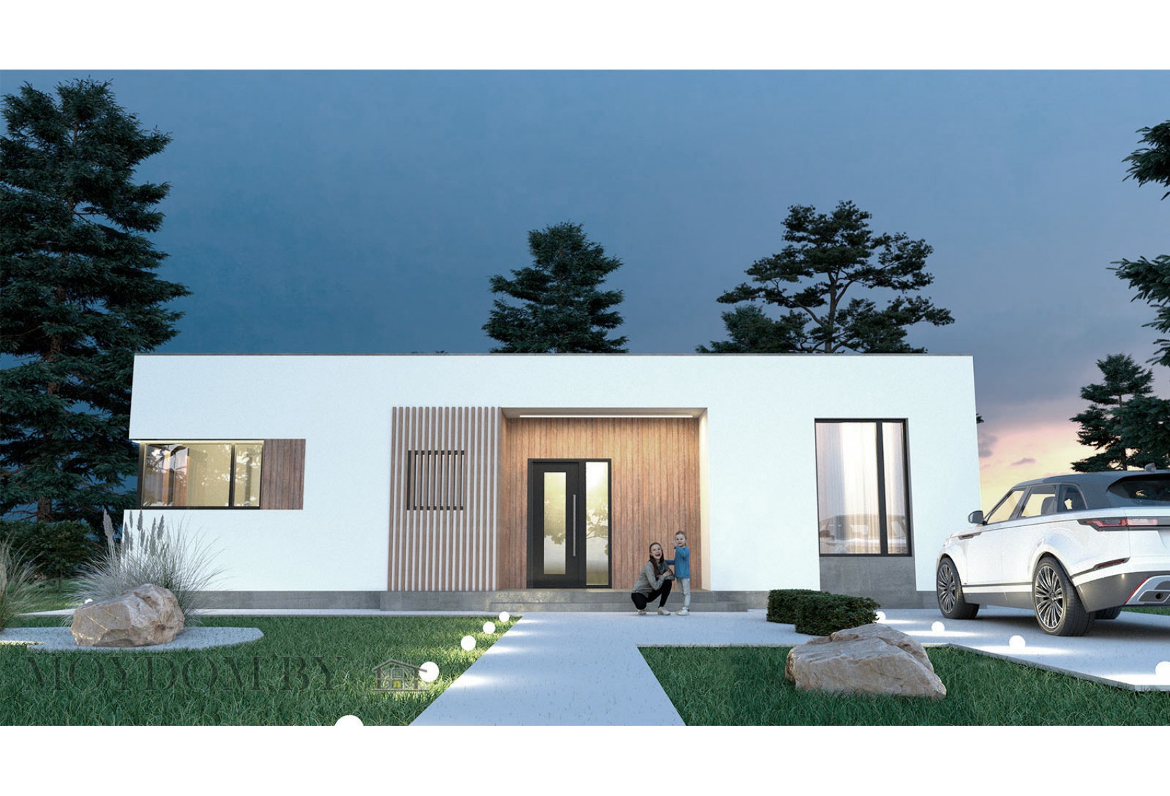 Modern projects of one-story houses with a flat roof and three bedrooms are now quite relevant. This house project is designed for a family with two or three children. The house is comfortable, besides the layout is worked out. The layout of the house takes its roots from the popular project 243, only instead of a hipped roof it is flat, and the appearance is completely different. Dont worry about the fact that a house with a flat roof - I, the author of the project, have already had such a roof since 2018 and it doesnt leak, so dont be afraid, you just need to know how to do it right, but I know :). You shouldnt be afraid of it. The layout of the one-story house is simple and comfortable: 3 bedrooms, kitchen, living room and bathroom. nodes. You can put a washing machine in the mini-boiler room, this is not prohibited, although it is better to put it after the acceptance of the gas workers in order to avoid unnecessary questions. Gas boilers are not afraid of moisture, so there is no problem. There is also a beautiful terrace where you can while away the long summer evenings, admiring the surrounding landscape. The design of the house meets modern requirements, the customer can determine the finishing of the facade himself. This project, like many modern houses, has - hinged panels from DSP, a hinged system filled with porcelain tiles, wood trim, brick (clinker) trim.