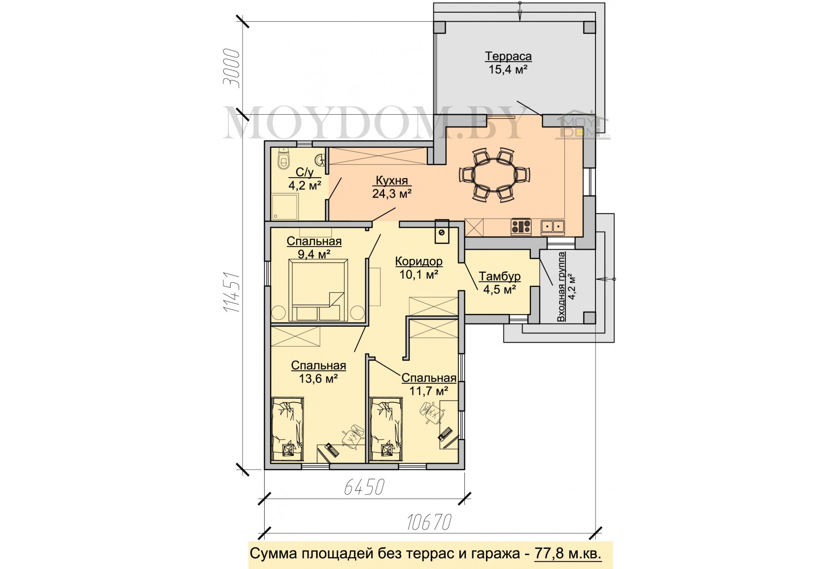 Теги: 11 на 11, до 100 кв.м., 3 спальни, с 4-х скатной кровлей, деревянный, реконструкция, из бруса, с террасой, небольшой, бюджетный, недорогой, гостевой, дачный.